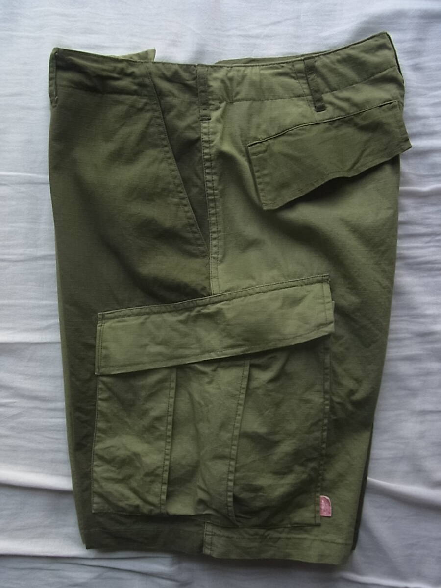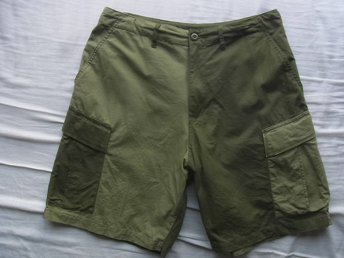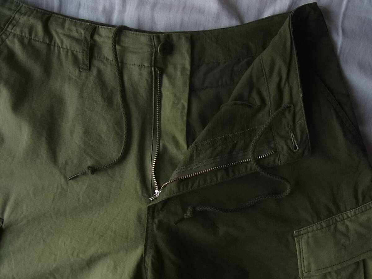 ヒンソンの濃淡オリーブのコットンリップストップ素材を切り替えたデザインのイージーカーゴショーツになります。USEDで着用感は御座いますが、特に目立ったダメージ等は御座いません。
