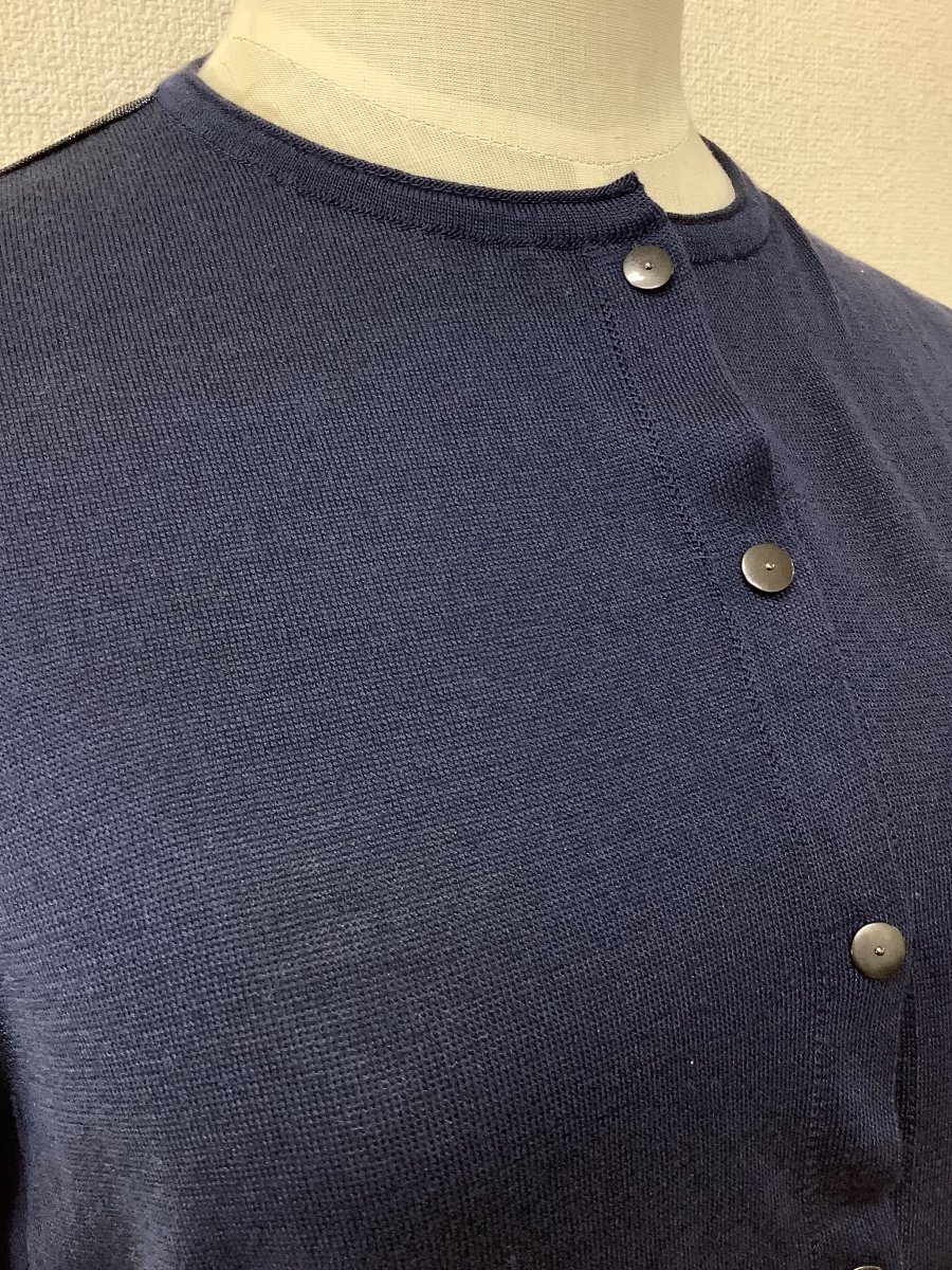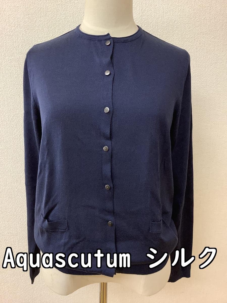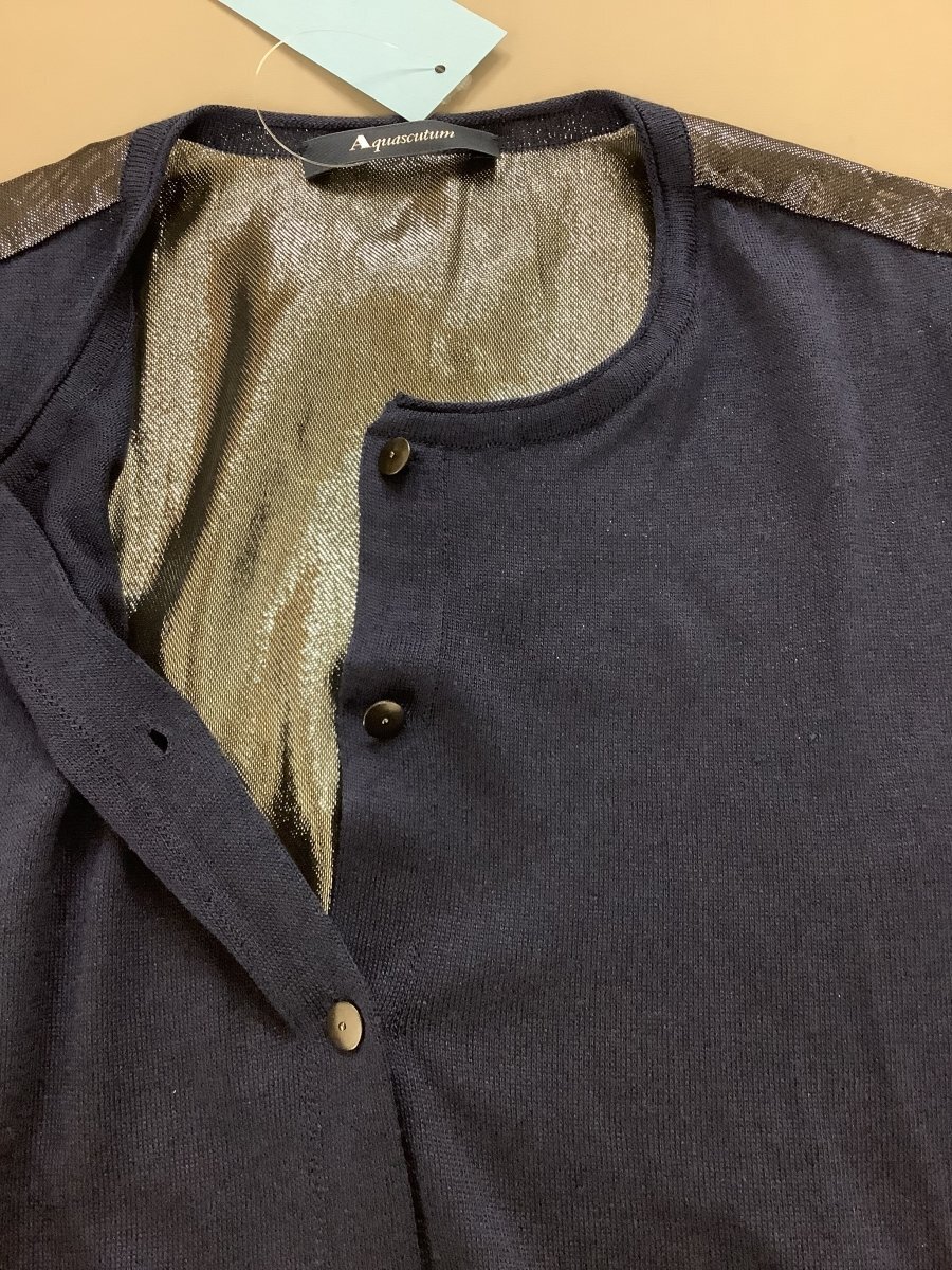 | アクアスキュータム (Aquascutum) シルクカーディガン ネイビー 後ろ身頃はメタリック 【表示サイズ】 なし 【平置き実寸】 脇下身幅 45cmほど 着丈 59cmほど 肩幅 35cmほど そで丈 56cmほど 【季節感】春夏向け 【状態その他】 目立った傷や汚れなし 後ろ身頃は透け感あり 当店管理番号:10^140212 |