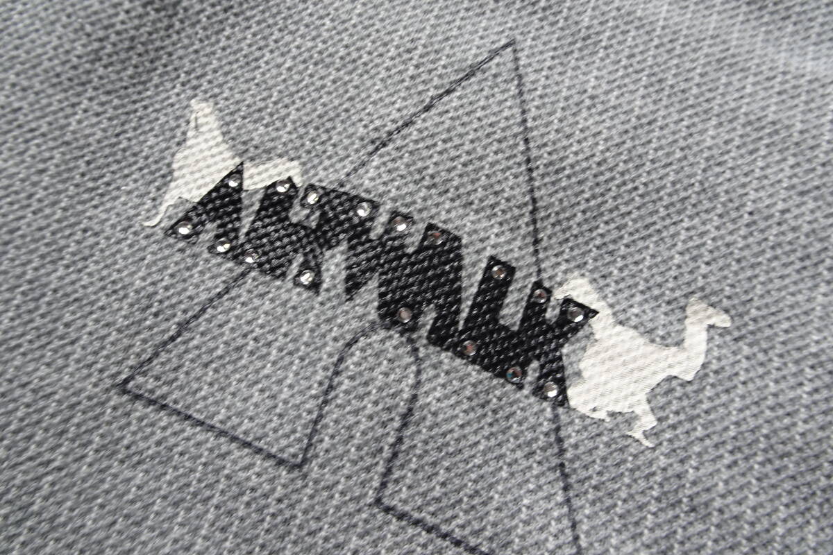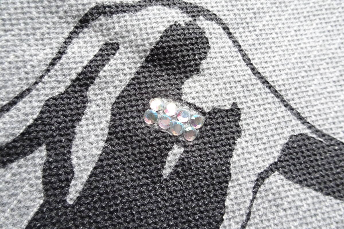 左胸、後身頃、ロゴ、イラストプリントの中に、ラインストーン装飾付きです。