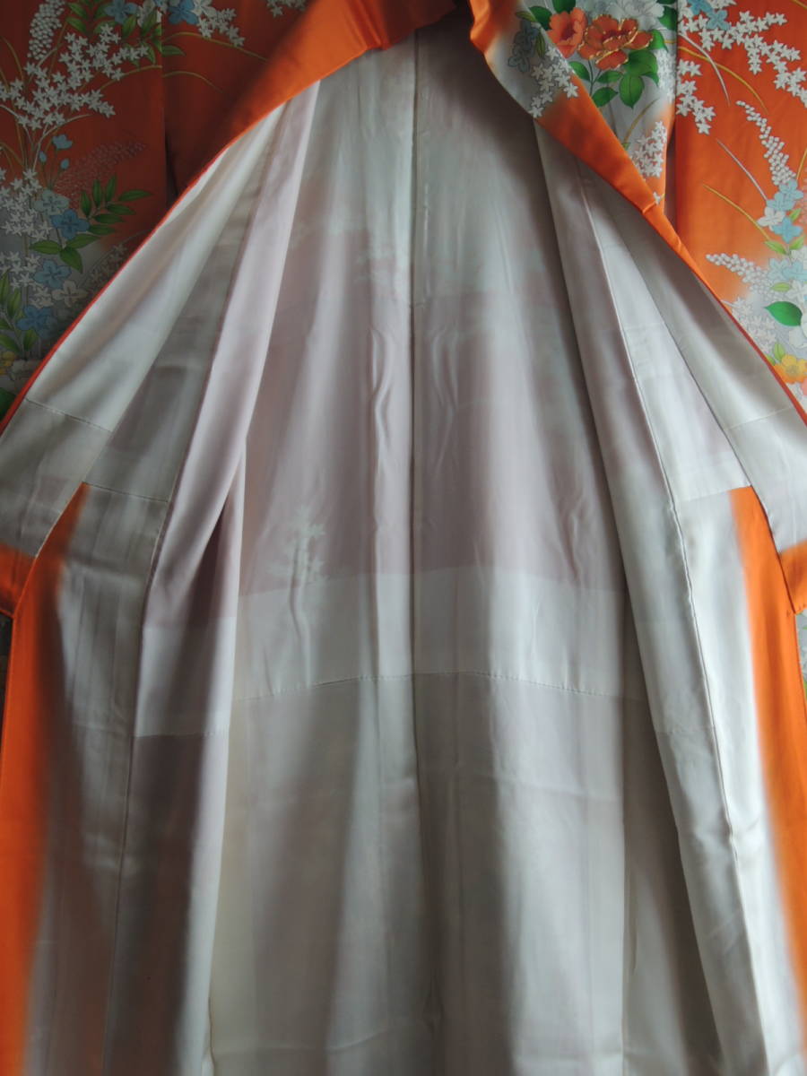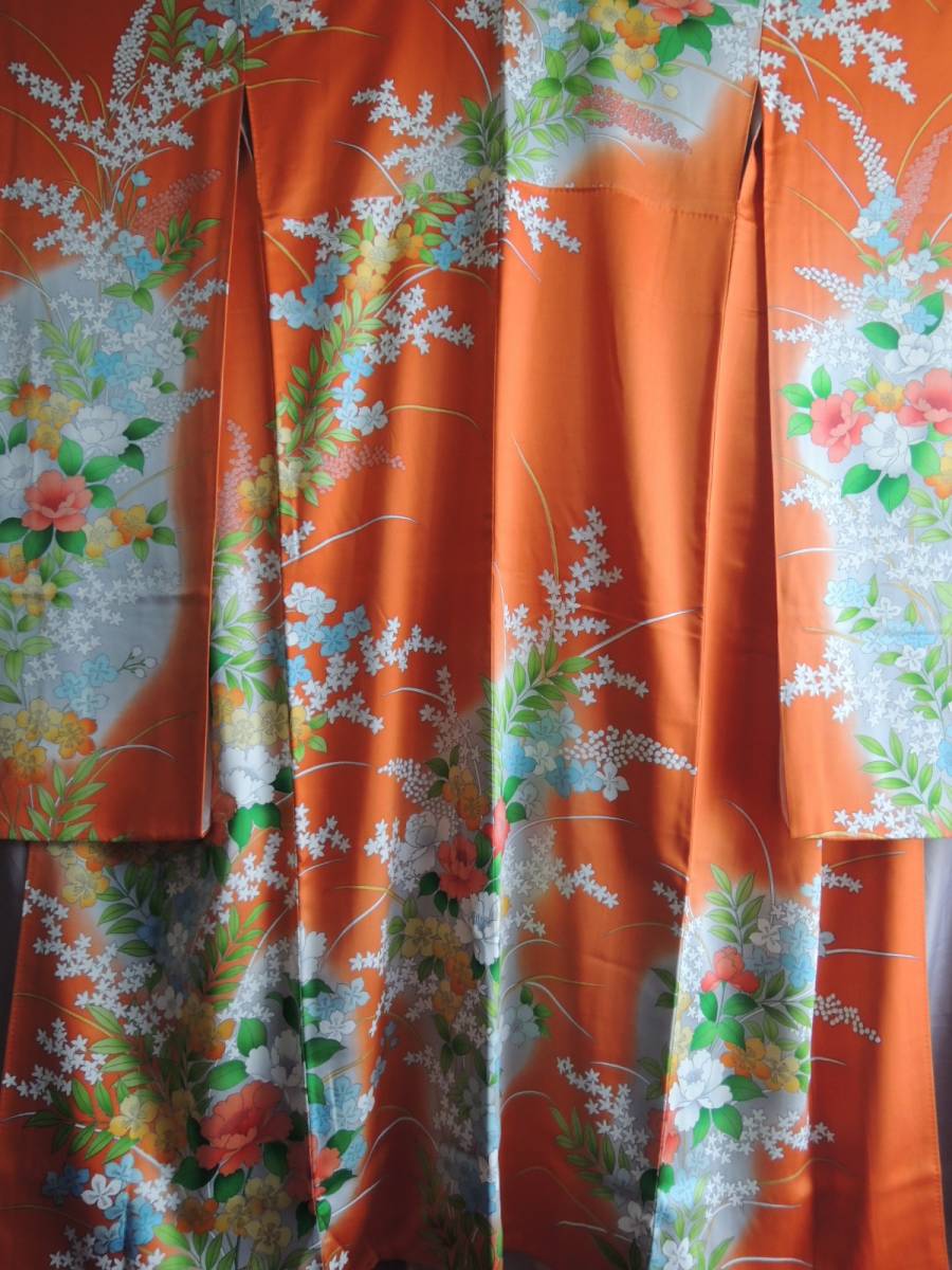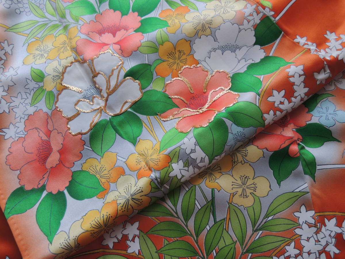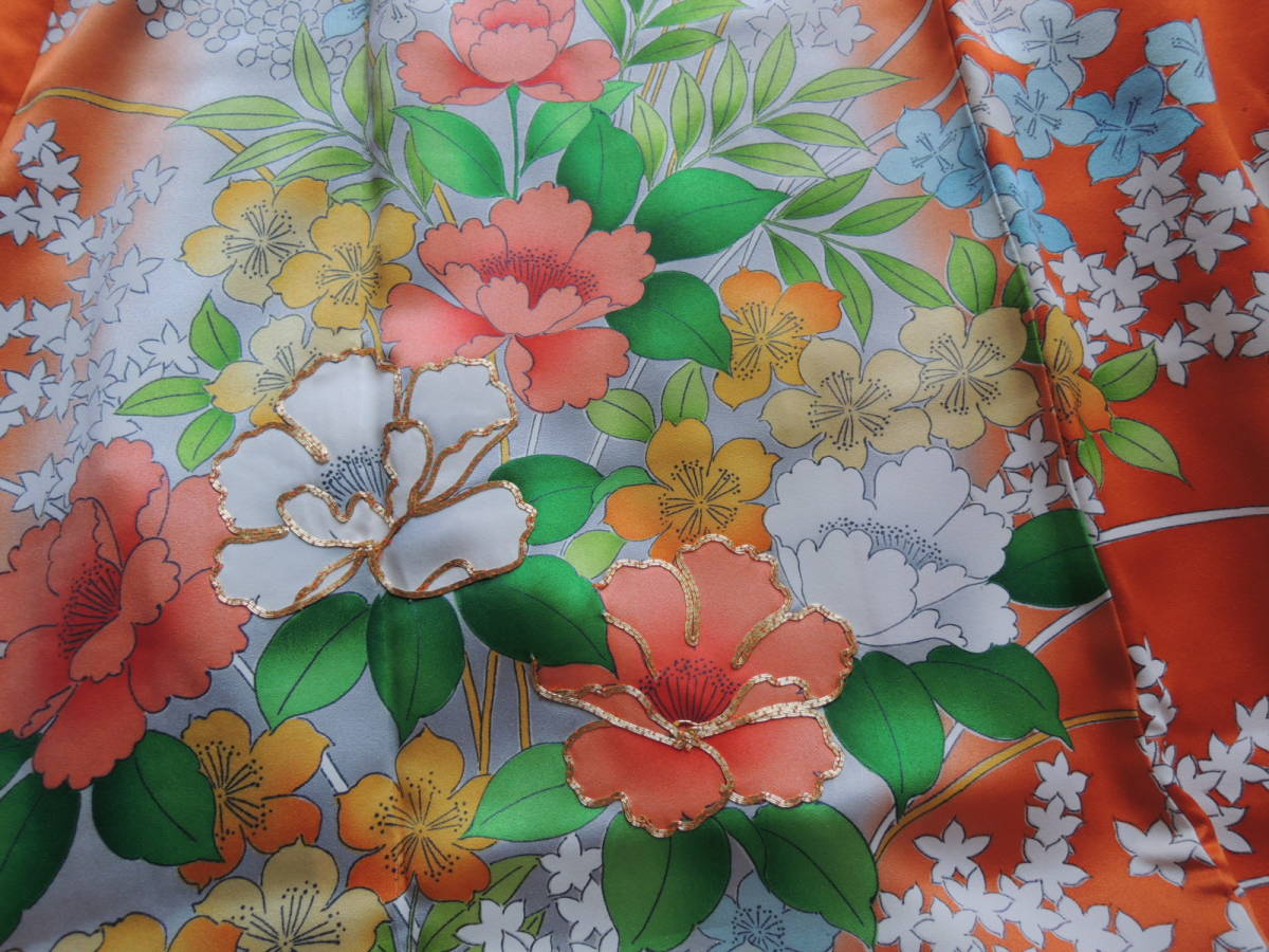 【正絹・金駒刺繍・花・オレンジ】丈158・袖105・裄65・美品