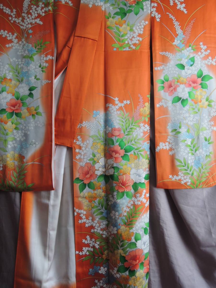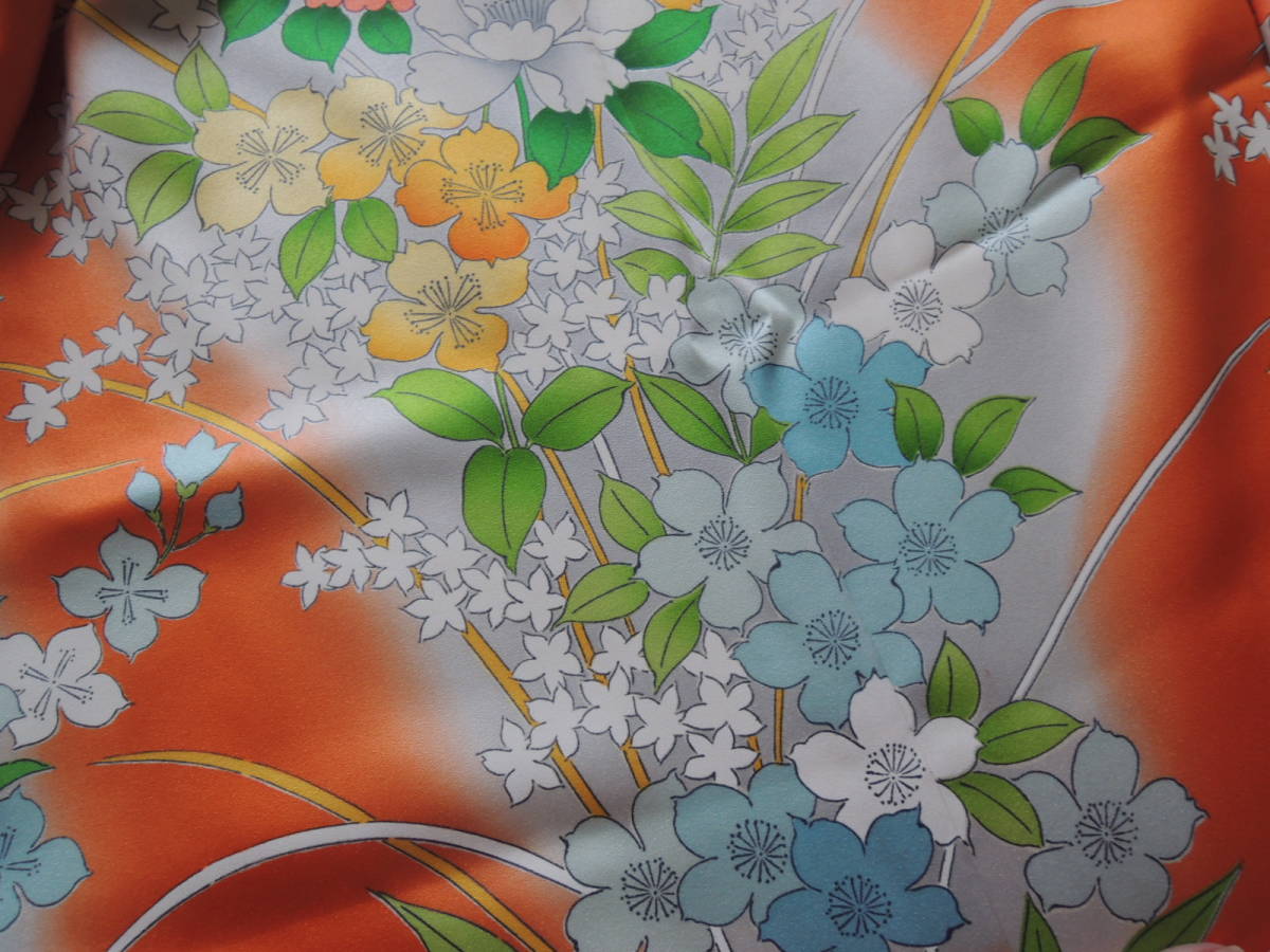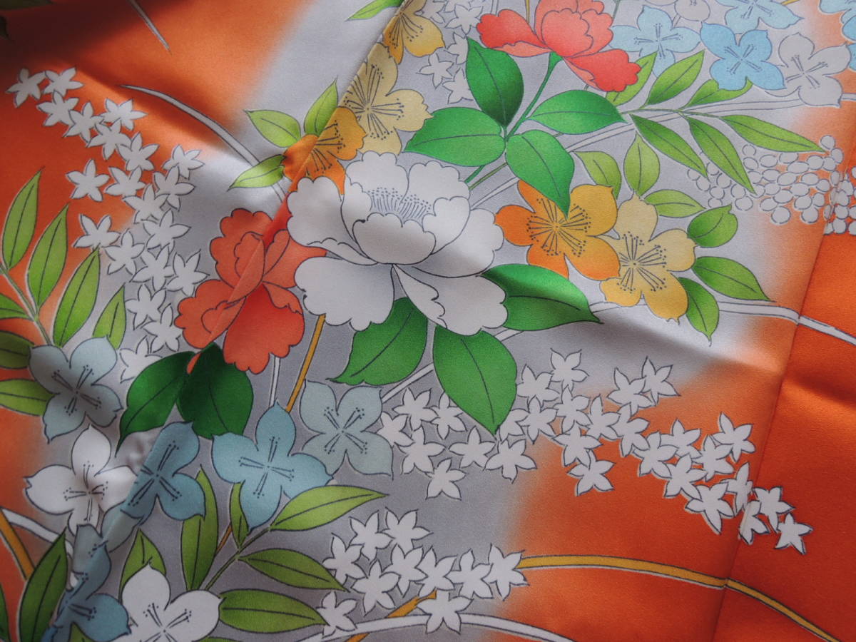 色合いも美しく オレンジの地に上品な柄裄が施され