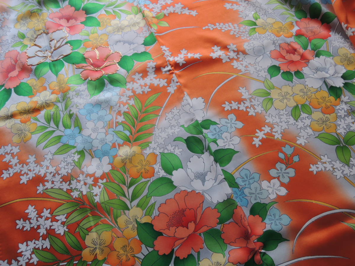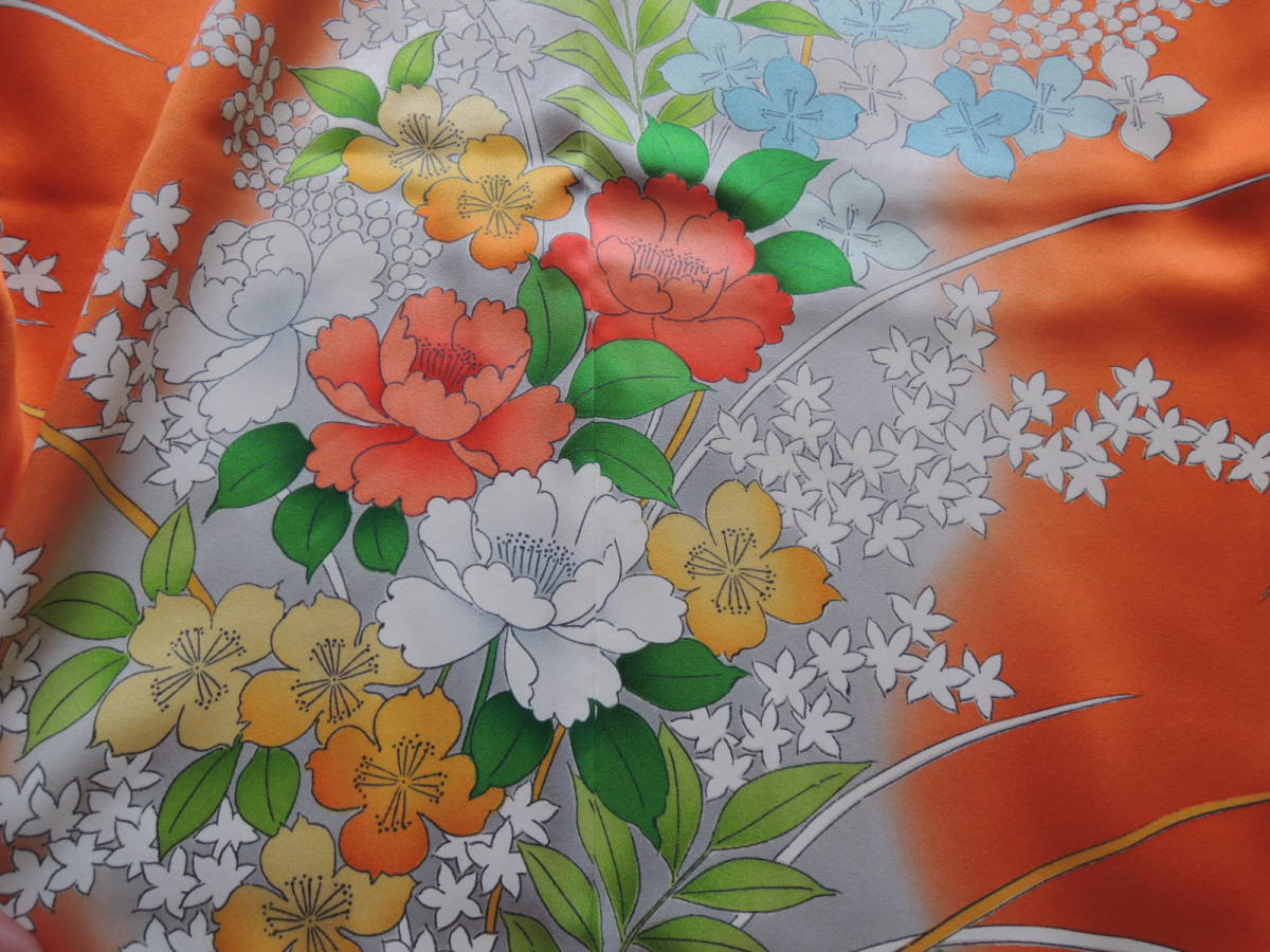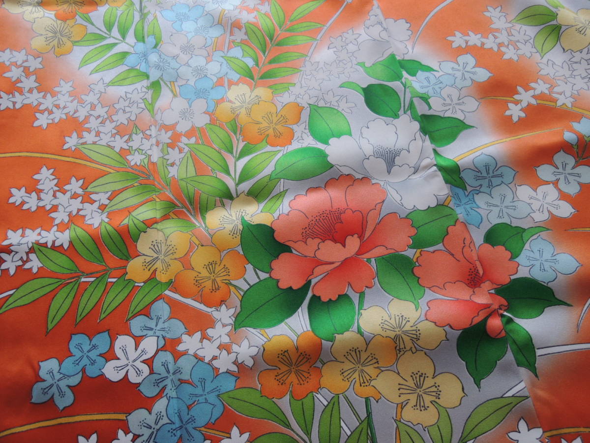 色合いも美しく オレンジの地に上品な柄裄が施され