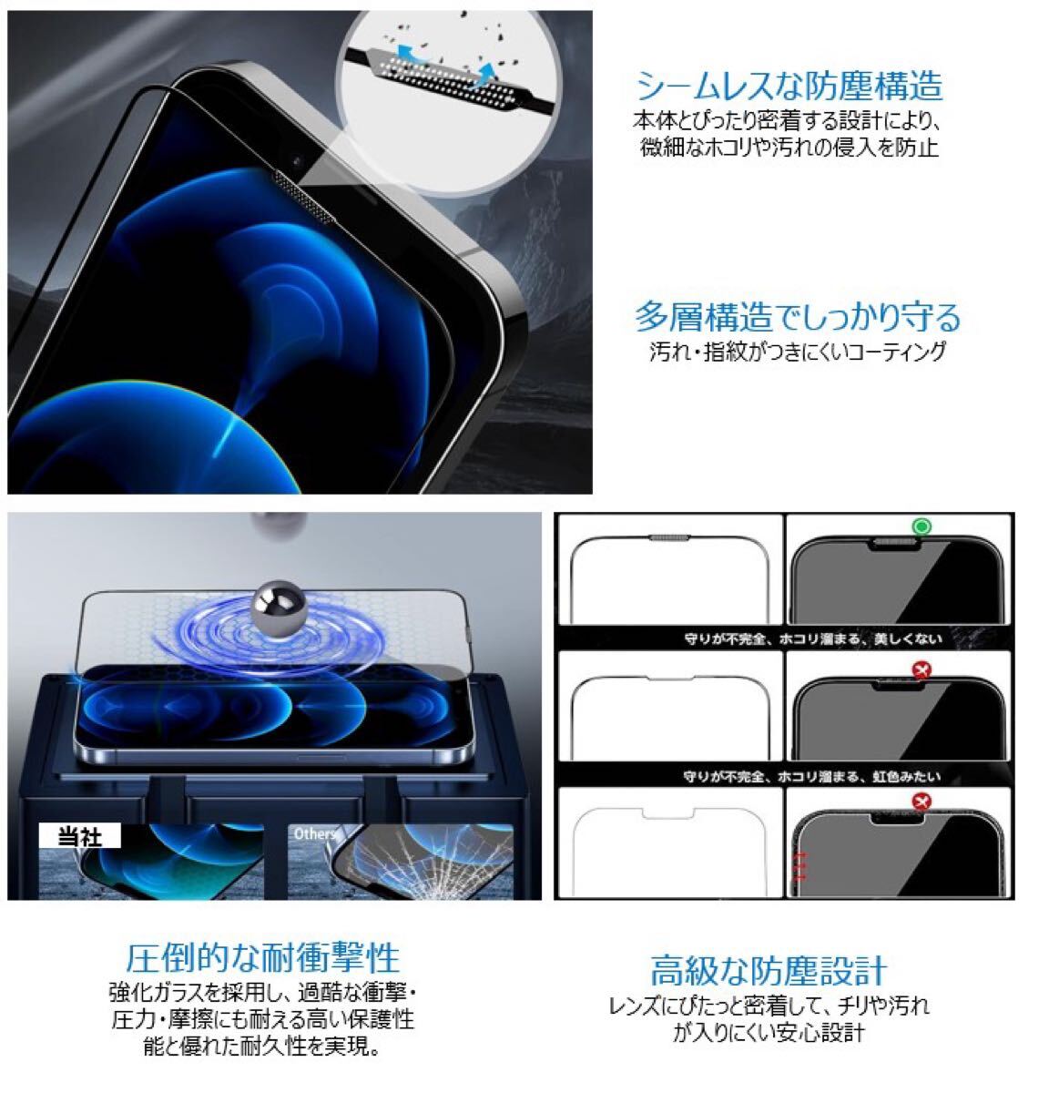 【強化黒縁で衝撃に強い】9H以上の強化ガラス+極細黒縁で画面全体をしっかり保護。【防塵設計で清潔&高音質】受話口までカバーする一体型防塵機能。ホコリを防ぎながら、音質はそのまま。【指紋防止&滑らかな操作性】防汚コーティングで指紋が付きにくく、スムース加工でゲームや文字入力も快適。【フルカバーで透過率抜群】湾曲までカバーするフルスクリーン仕様で、99%以上の表示領域を保護。まるで貼っていないかのような透明感。