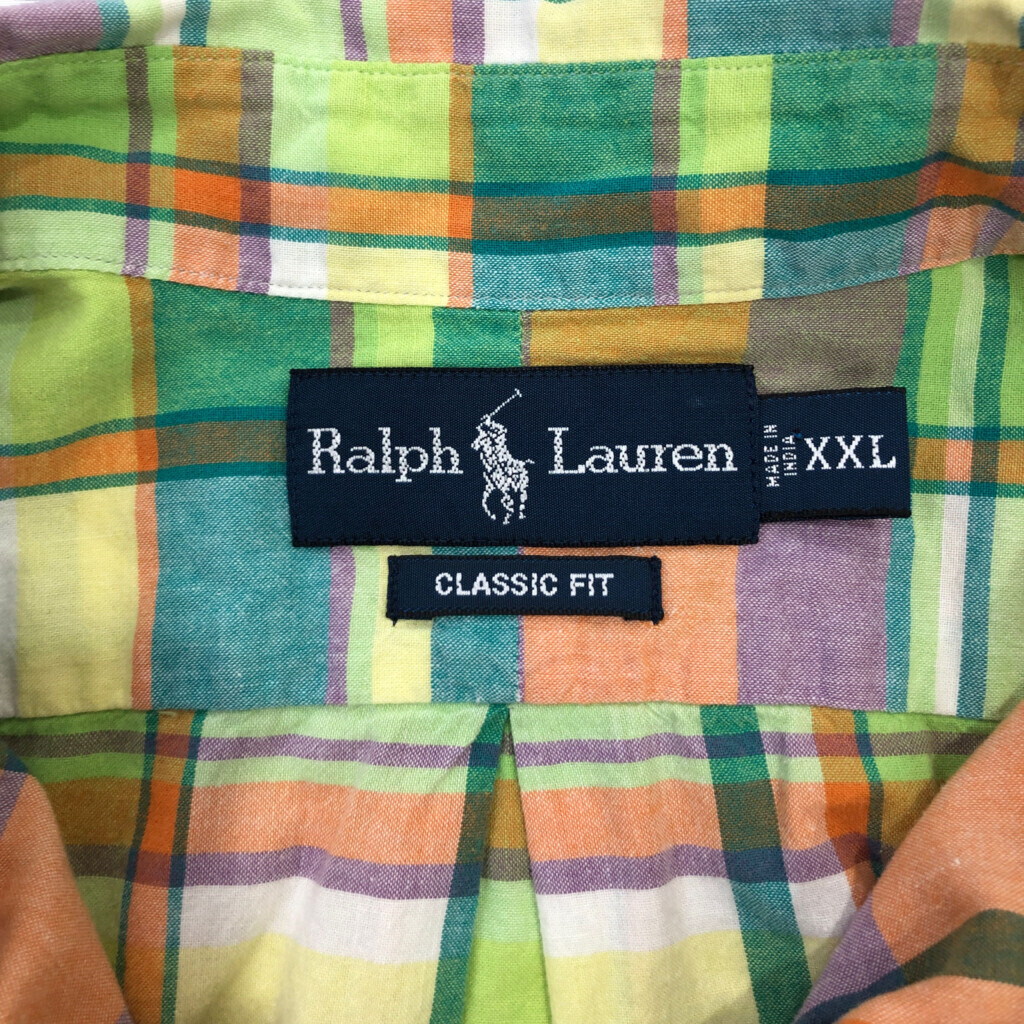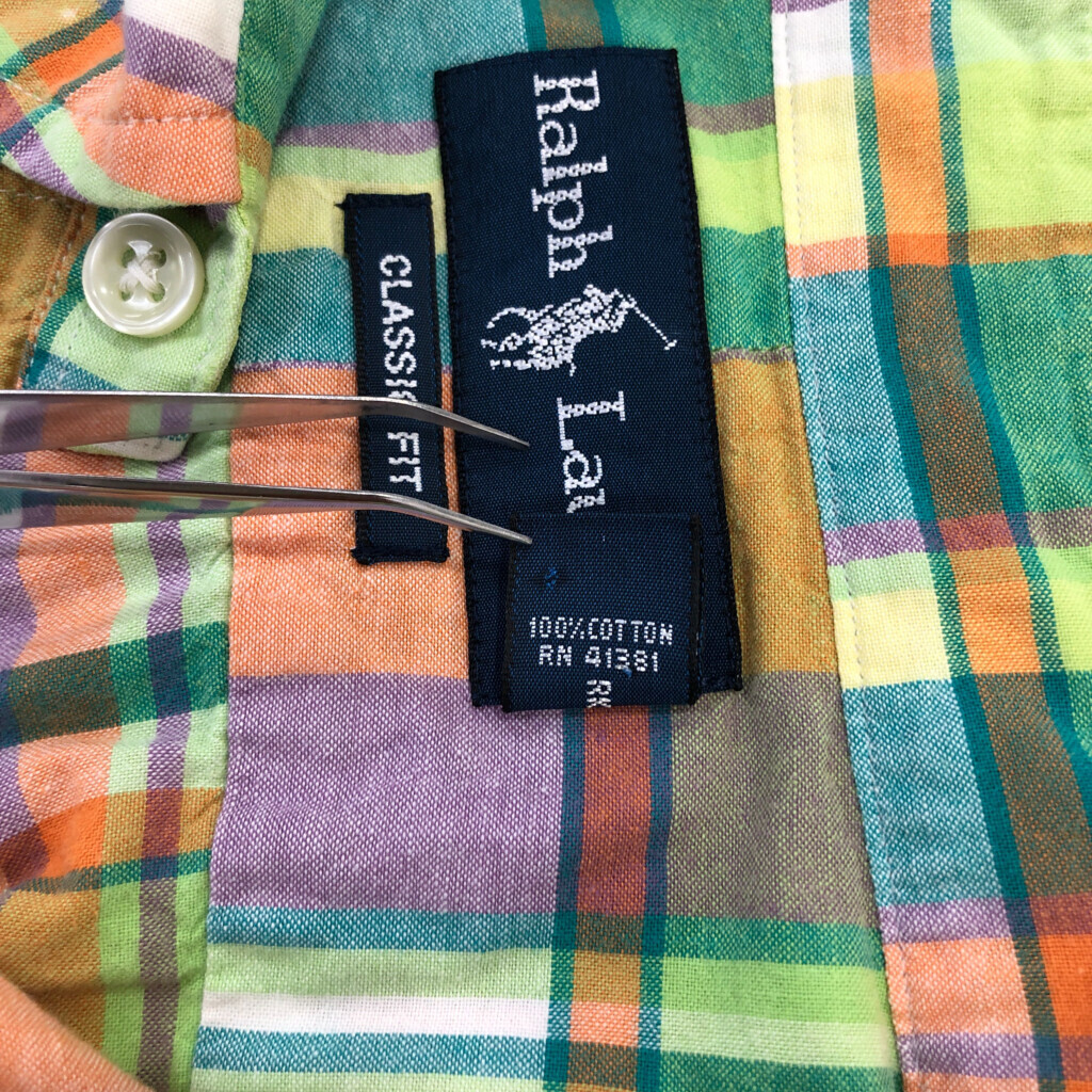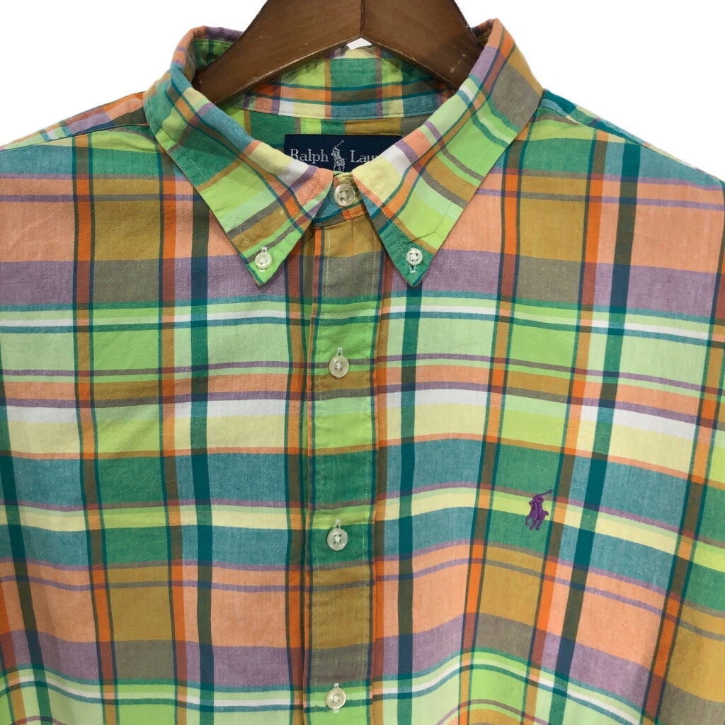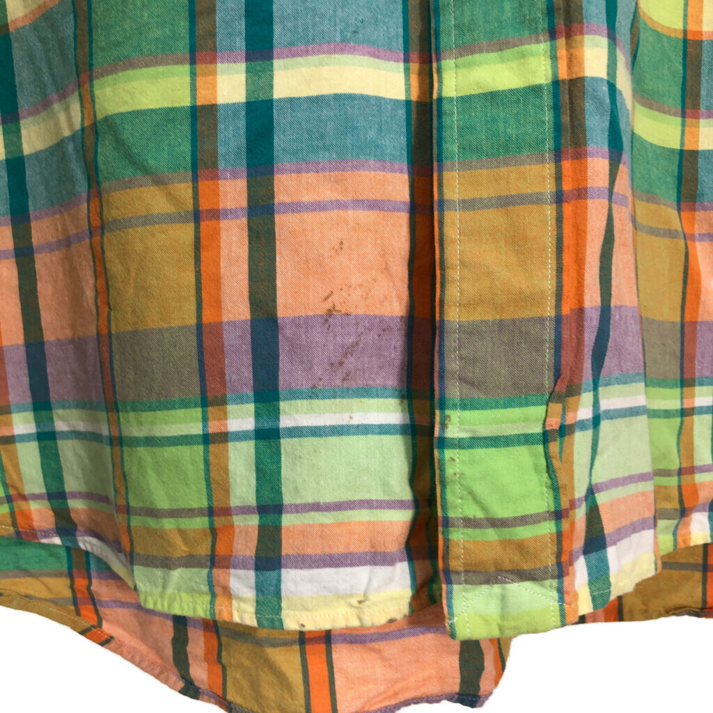 | [商品管理番号] T5826 [ブランド] RALPH LAUREN/ラルフローレン [サイズ] XXL [実寸サイズ] 肩幅:約52cm 着丈:約76cm 身幅:約72cm 袖丈:約26cm [主な素材] 表地 : コットン [色] マルチカラー [仕様] ボタンダウン シングルステッチ マドラスチェック [状態] 汚れ:裾 | |||