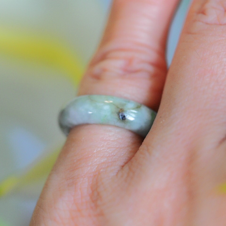 こちらのヒスイはホワイト、グレー、ブラックにグリーンが混ざったナチュラルなカラーの糸魚川翡翠リングです。