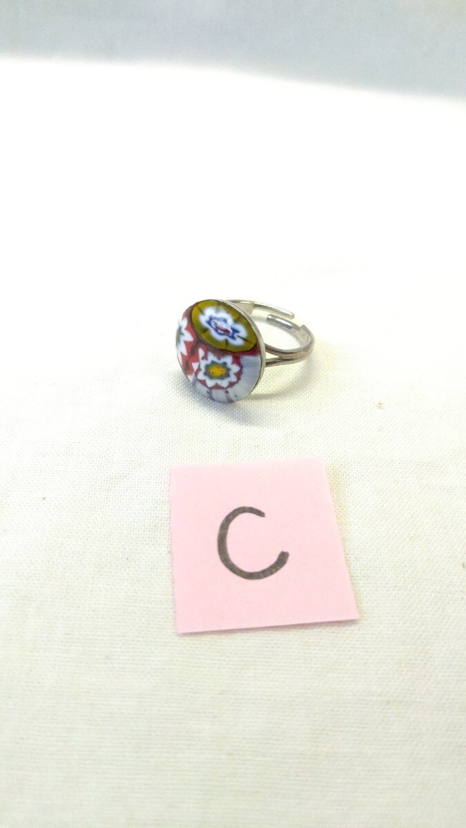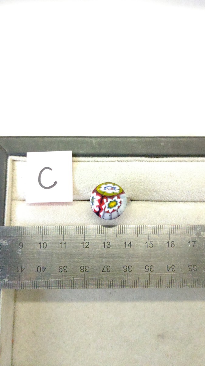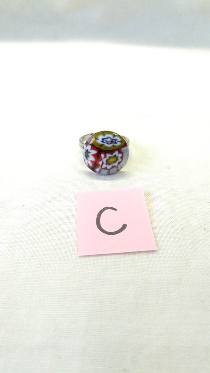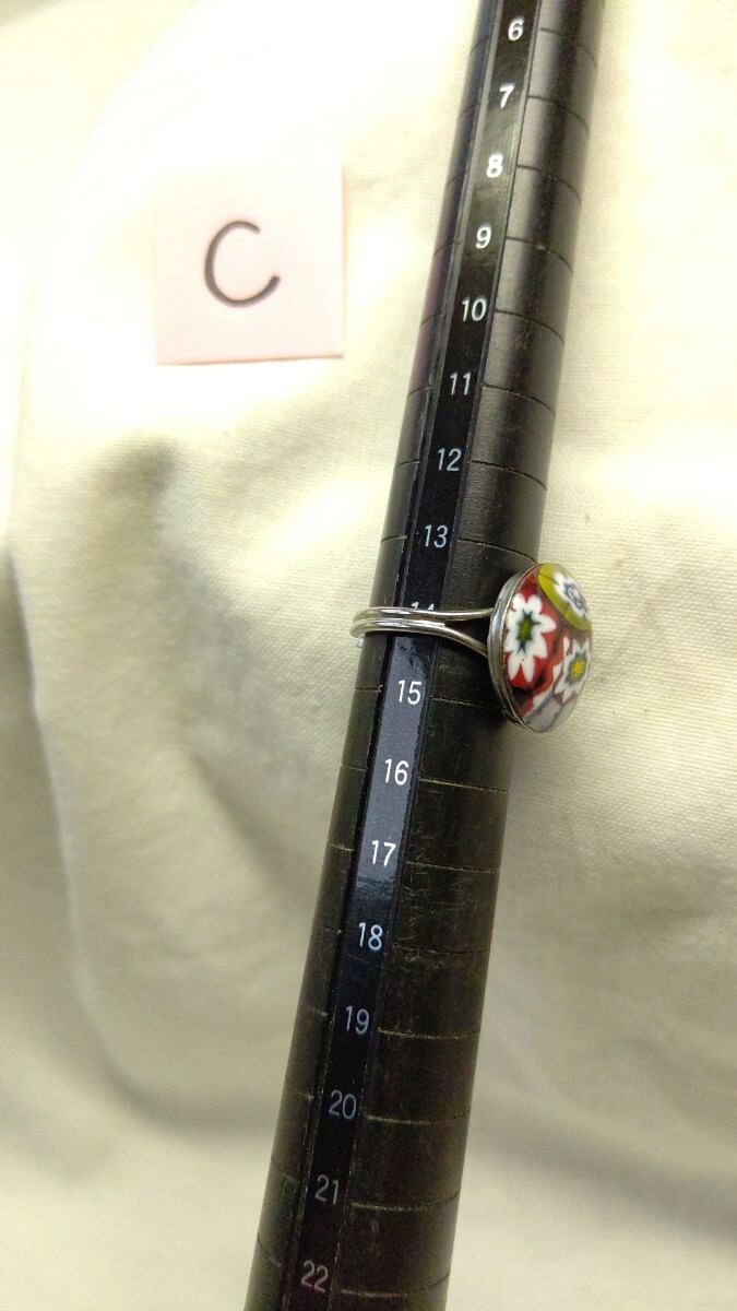ベネツィアンガラスデザインリングの出品となります。フリーサイズで、ベネチアンガラスのシェブロンビーズを使用したデザインで、ミルフィオリビーズに近いデザインとなります。金属部分は銀ではございません。なお、今回出品したものだけで、他に在庫はございませんので、ご注意ください。
