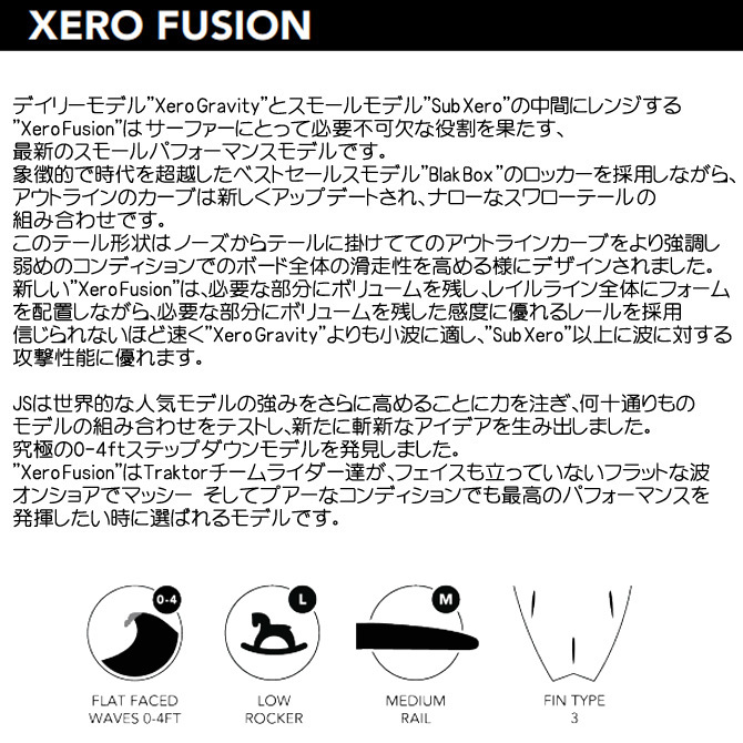 この組み合わせは、近年JSが愛用している多くのボードに採用されている。Xero Fusionは、瞬時に加速するBlak Boxロッカーにより驚くほど速く、Xero Gravityに比べ小波に適している。ロッカーはフラットで、どんなデッドスポットでも飛び抜けるようにデザインされているが、十分なカーブがあるため、ポケットで激しくプッシュしたりターンしたりすることができる。