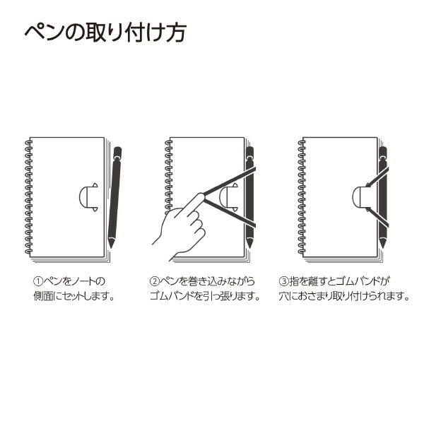 ●小口にペンを取り付けて持ち運ぶことができます。筆記具全体をゴムバンドで巻き込んで留めるので、筆記具のクリップの有無に限らずホールドすることが可能です。