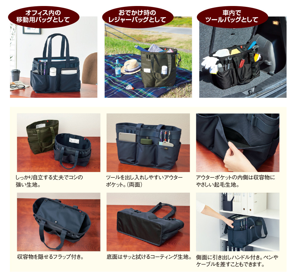 ○軽いのにしっかり自立する、大容量で便利なツールバッグ。