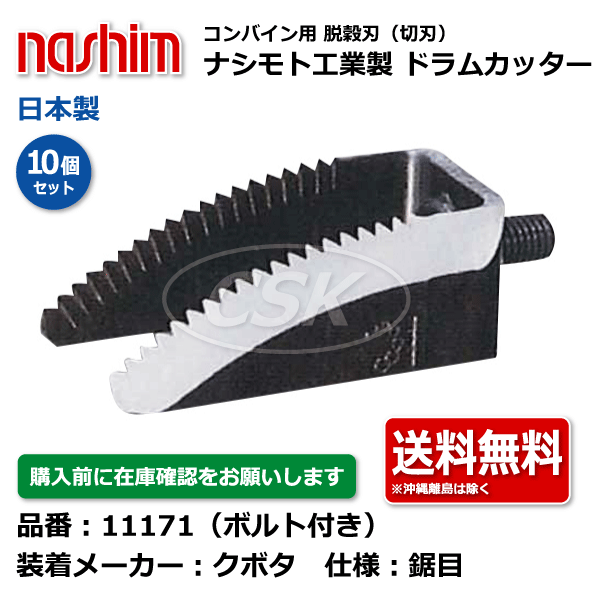 11171 クボタ 鋸目 10個セット 切刃 脱穀刃 コンバイン ドラムカッター ボルト付 ナシモト工業 nashim 日本製 ★要在庫確認 送料無料