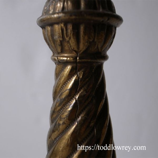インテリアのアクセントに最適な優雅なテーブルランプのご紹介です。 まず、ランプ本体は脚裏に「FRANCE」の刻印が押されたブロンズ製。支柱部分はツイストのモチーフ、ベース部分は四角錐をベースにCスクロールや小花モチーフが巧みに散りばめられており、可憐で優雅な雰囲気を演出しております。意匠の細かい部分は左右非対称となっており、18世紀フランスの宮廷から生み出されたロココ様式を感じさせます。 スイッチ部分は樹脂製であるため、おそらくこのランプ本体が作られたのは1930年代頃と推測いたします。数世紀にわたって愛され続け、そして今後もまた愛されていくであろうフランスの伝統様式をしっかりと体現しています。 ランプ本体を買い付けたのは英国のマーケットでしたが、その時はシェードはついておりませんでした。日本で専門業者に依頼して日本仕様に修理し、その際にオリジナルのスィッチは念のためコードから外しております。別の機会に手に入れた、英国のヴィンテージシェードが、雰囲気が合っておりましたので、セットしてご紹介させていただきます。 小さめながらもずっしりと重いランプは、灯せばあかかたな光で周囲を照らします。 光で更なる輝きを放つベースの凝った装飾を愉しみつつ、静かな夜をお過ごしください。 ◆ランプ本体France/シェードEngland ◆推定製造年代:ランプ本体c.1930年代頃/シェードc.1950-1970年代頃 ◆素材:ブロンス、布、その他 ◆サイズ(シェードを取り付けた状態):高さ約33cm/シェード直径約14.3cm ◆ランプ本体ベース部分サイズ:約11.8×11.5cm ◆重量(シェード付):約836g ◆在庫数:1点のみ(シェードつきテーブルランプ1点) 【照明に関してのご注意】 ◆使用電球:口金E17(日本の一般的なねじ込み式) 消費電力40Wまで(1ソケットにつき)。電球は付属しません。 ◆撮影に使用した電球はE17口金 25W ベビーボール球直径50mmです。このサイズでシェードはとまりますが、やや動きやすいです。50mm直径より少し大きいもののほうが良いかもしれません。 ◆買い付け当時はソケットやコードは古いものでしたが、日本の専門業者に依頼して、安全な日本仕様の真鍮製ソケット、茶の布撚りコード(中間スィッチ・コンセントつき)にお取替えいたしました。 ◆安全上、ベースについている古いスィッチは現在は通電しておりません。新設の中間スィッチでON/OFFを行ってください。 ◆コードは約2mございます。 ◆白熱灯を長時間点灯しておくとソケット・シェード部分は熱くなります。白熱灯色のLED電球がお勧めです。お取り扱いには十分ご注意ください。 ◆ソケットにはねじ式のリングが付属しておりますので、サイズが合えばお手持ちのガラスシェード(取付口約3cm程度のもの)をセットすることも可能です。 【NOTE】 *古いお品物ですので、一部に小傷や汚れ、錆びや変色、材の傷みがみられます。 *布シェードにはわずかに汚れがみられます。点灯すると気づかない程度かと思います。画像にてご確認ください。 *発送の際はシェードは外した状態で梱包いたします。お手数ですが取付はご自身でお願いいたします。工具は必要ございません。 *平滑面に置くと少しカタつきます。気になる方は、布を敷くか、足にフェルトを貼ること等をおすすめいたします。 *画像の備品は付属しません。 *上記ご了承の上、お求めください。 |