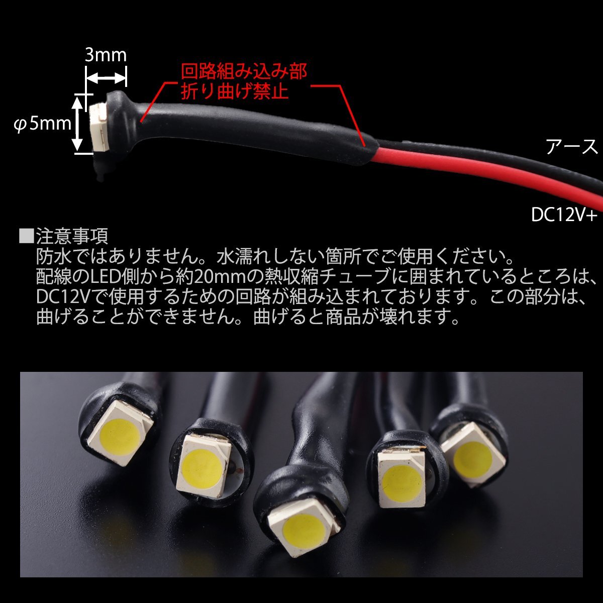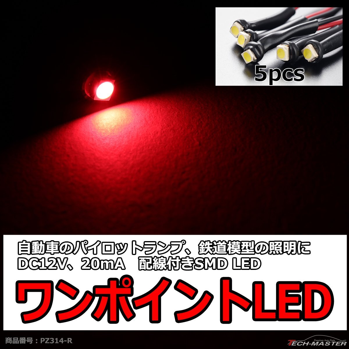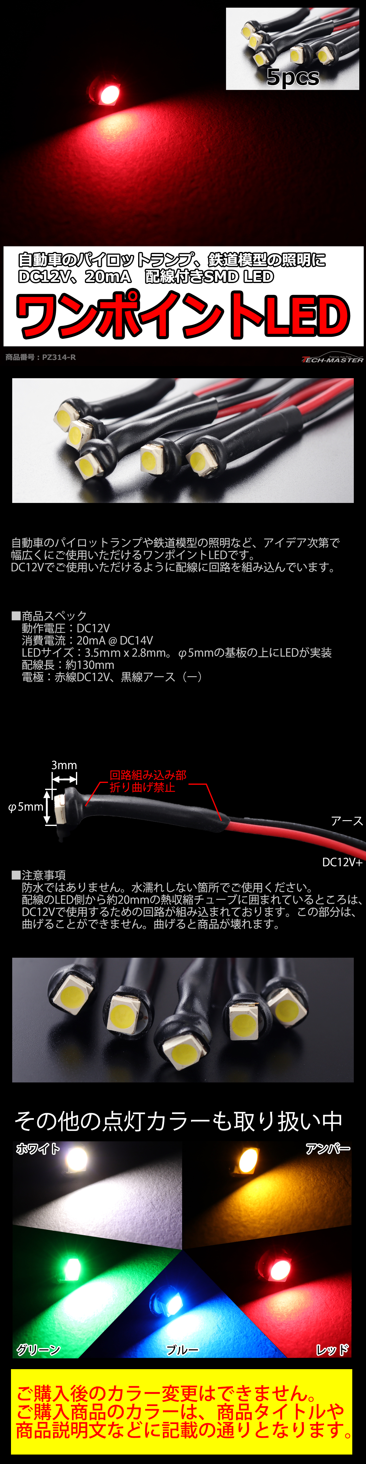 | ワンポイントLED 5本セット 数量:1セット5本 対応電圧:DC12V 消費電流:20mA @ DC14V 点灯色:レッド LEDサイズ:3.5mm×2.8mm。φ5mmの基板の上にLEDが実装。 配線長:約130mm 電極:赤線DC12V、黒線アース(ー) |