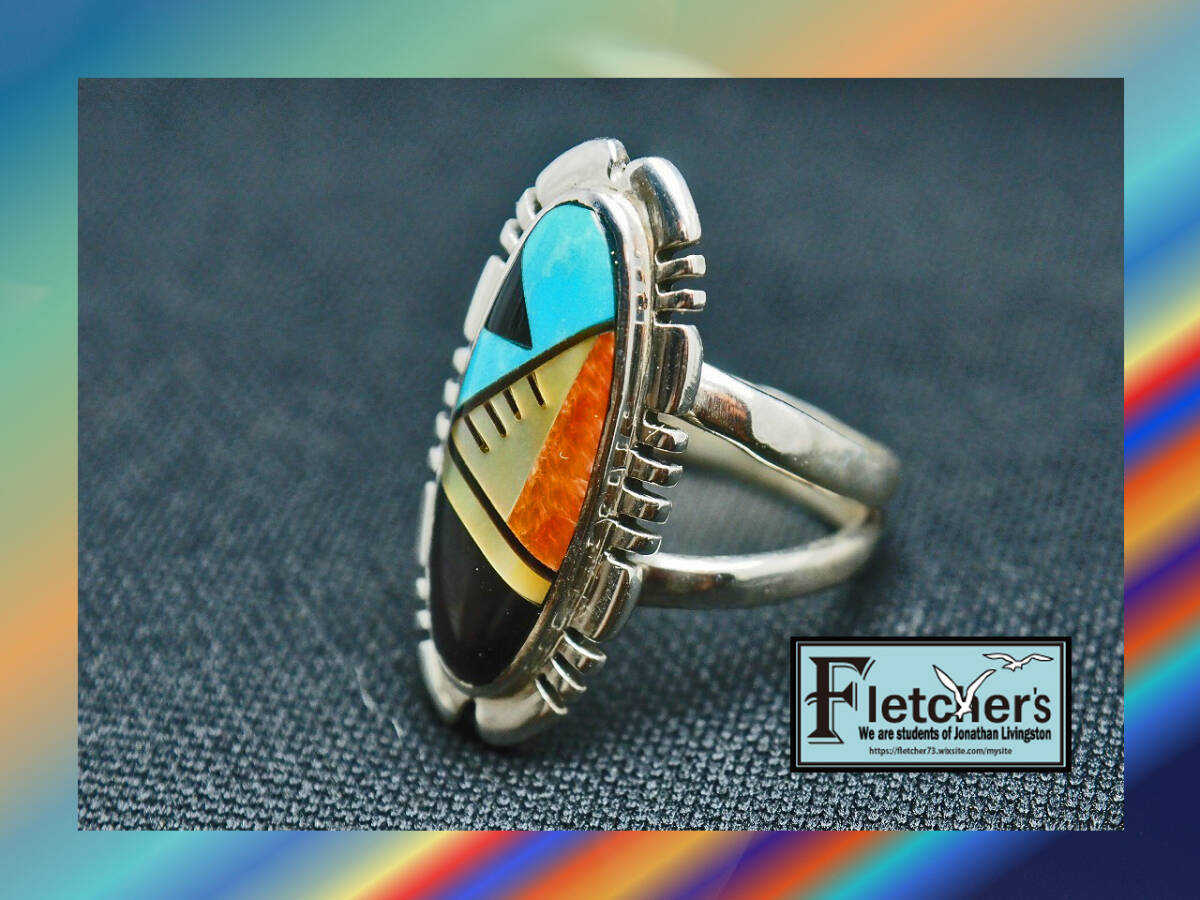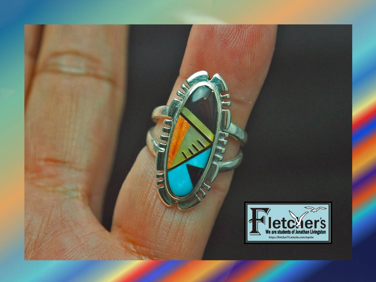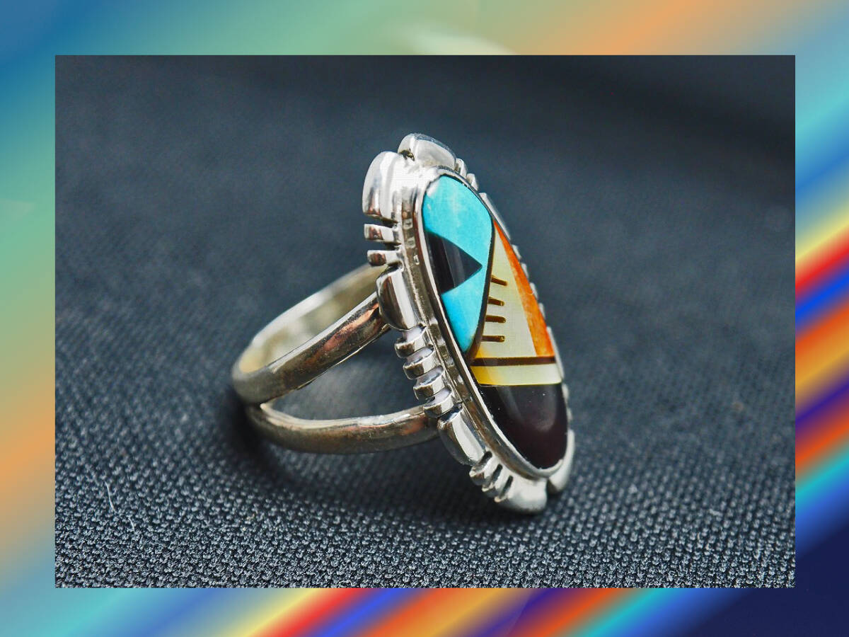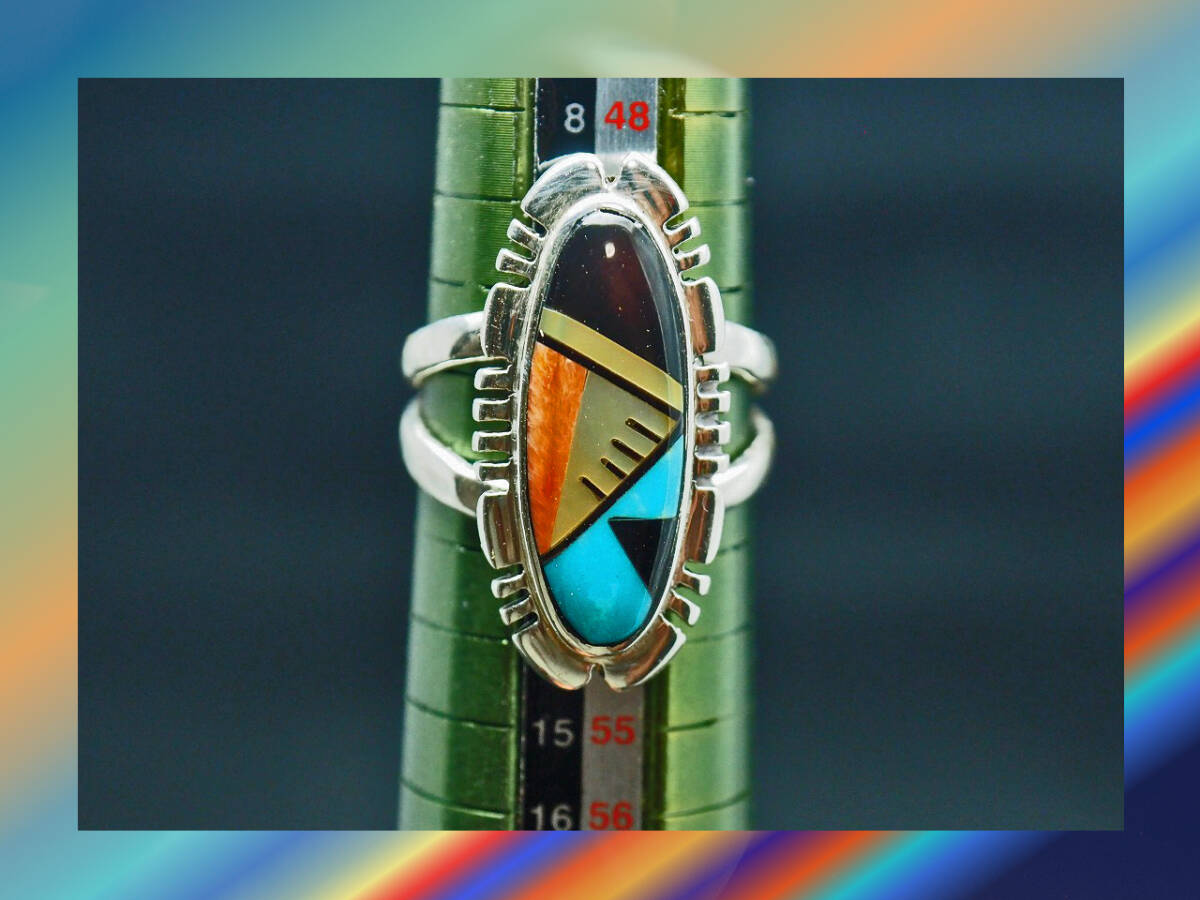 質感あるシルバーの地金に細密にカットしたマルチストーン(ターコイズ、マザーオブパール、オニキス)をモザイク状に組み上げた物を埋め込んだ、美しいリングです。