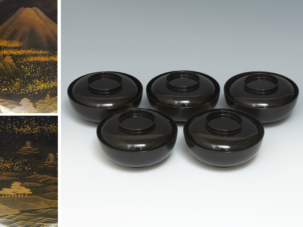 真塗 富嶽蒔絵 煮物椀 5客揃 懐石道具 茶道具 漆芸 漆工芸 天然木 木工芸 |