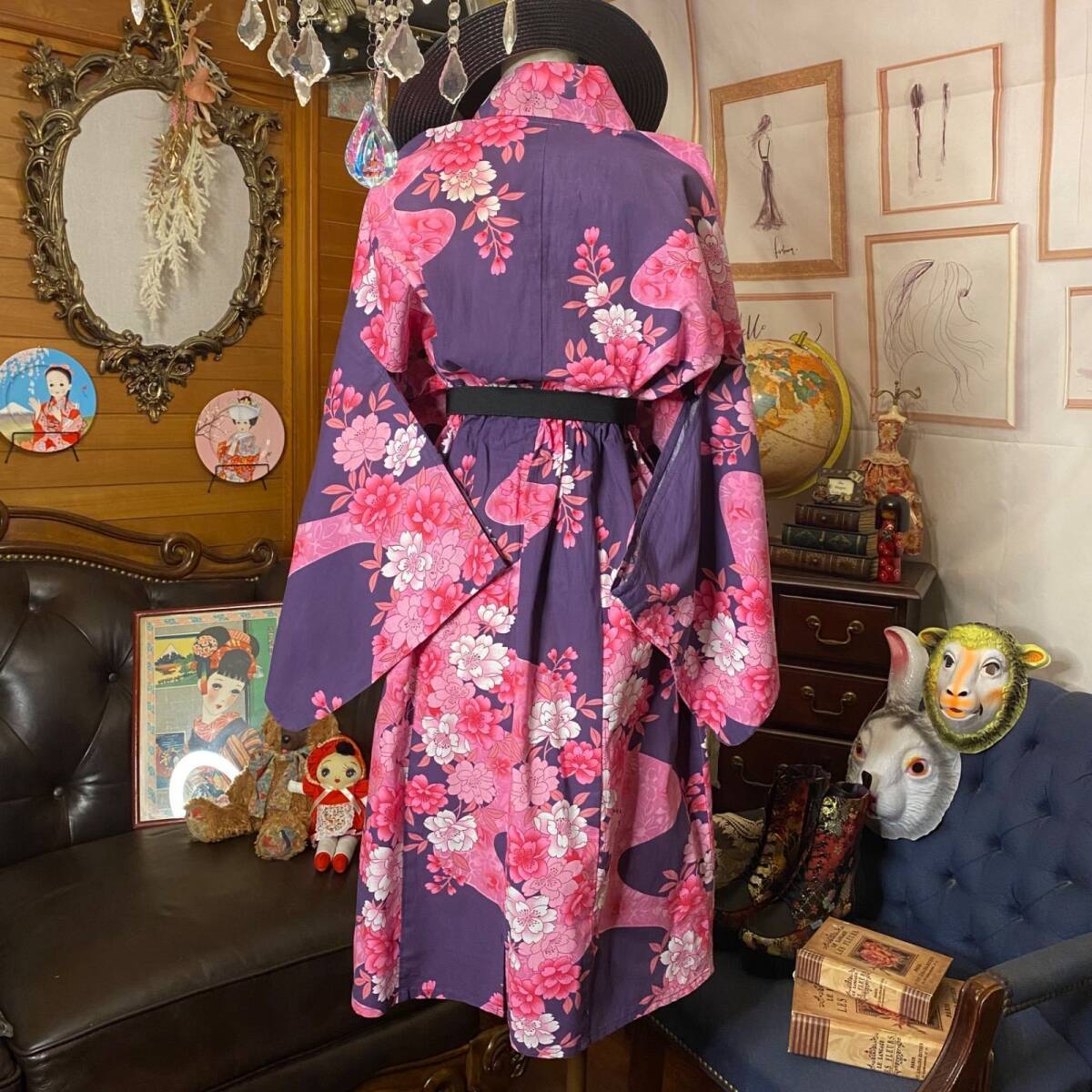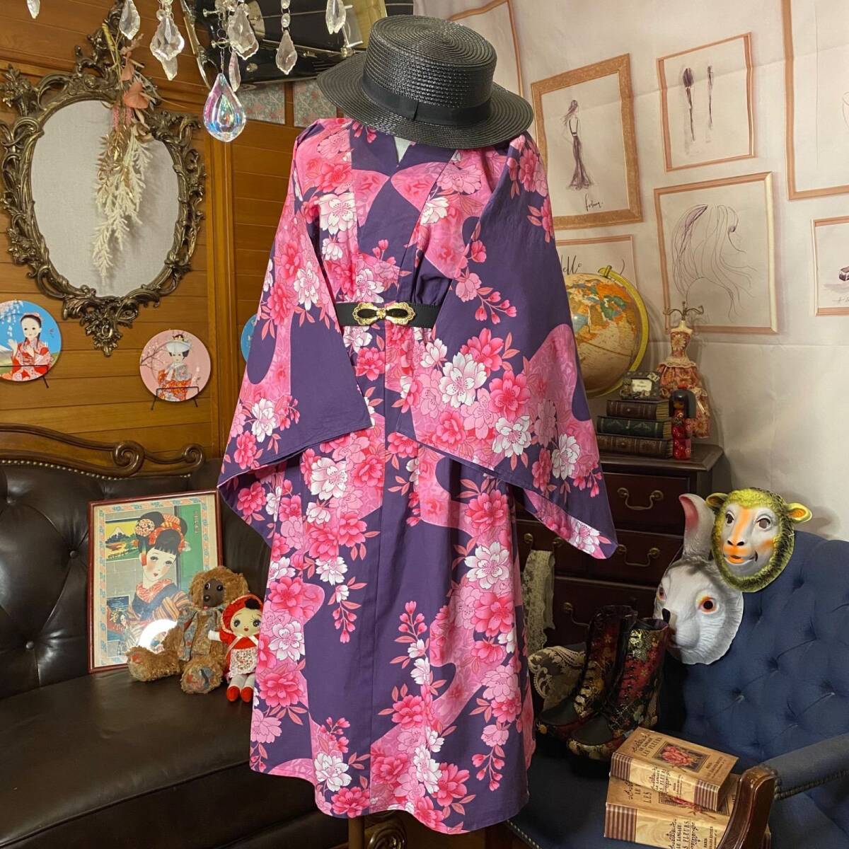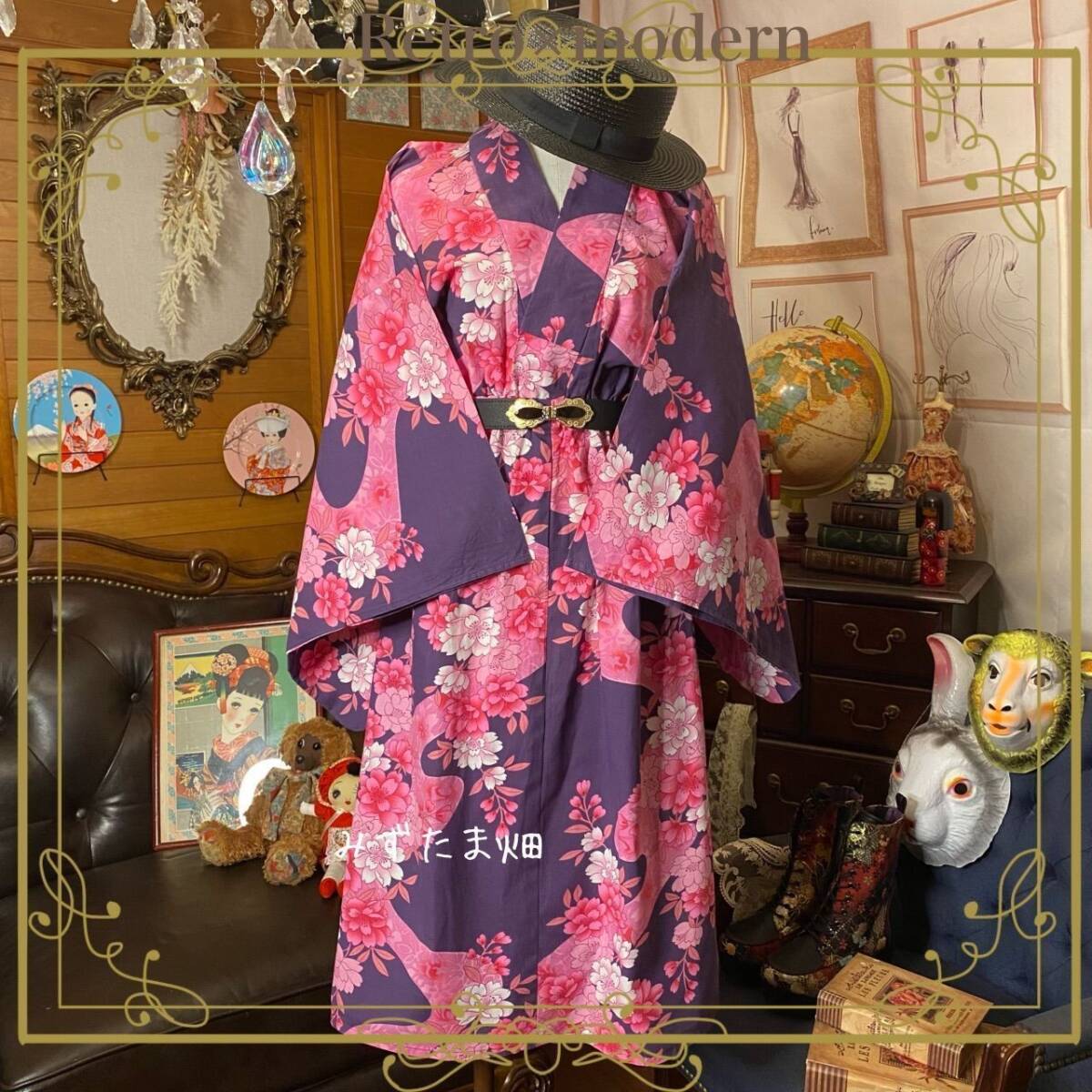 【 和洋折衷 レトロ 古着 お花 フラワー 浴衣 和 モダン ハンドメイド リメイク ワンピース パープル/紫× ピンク 系 W-108 】