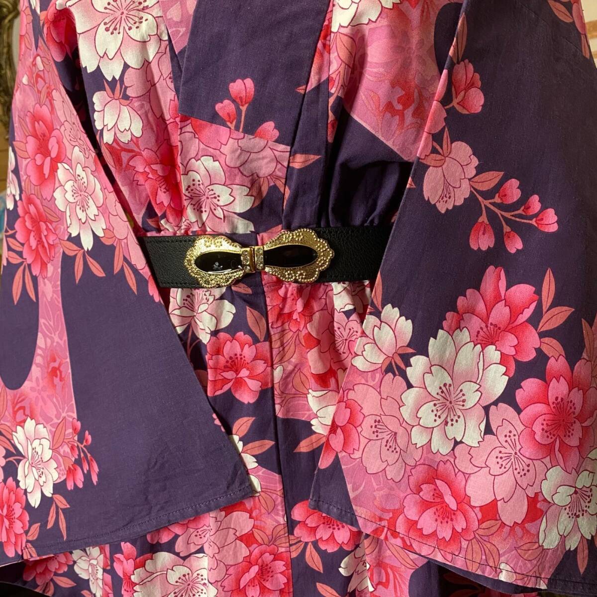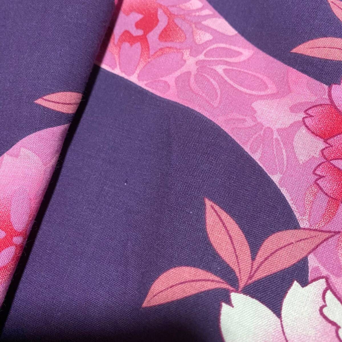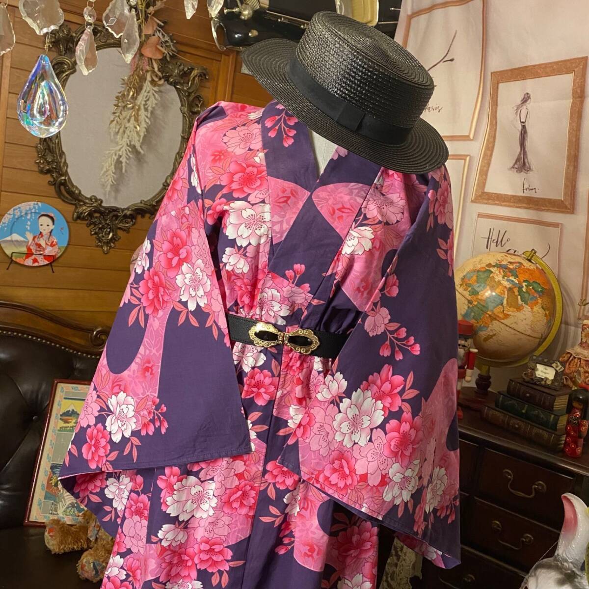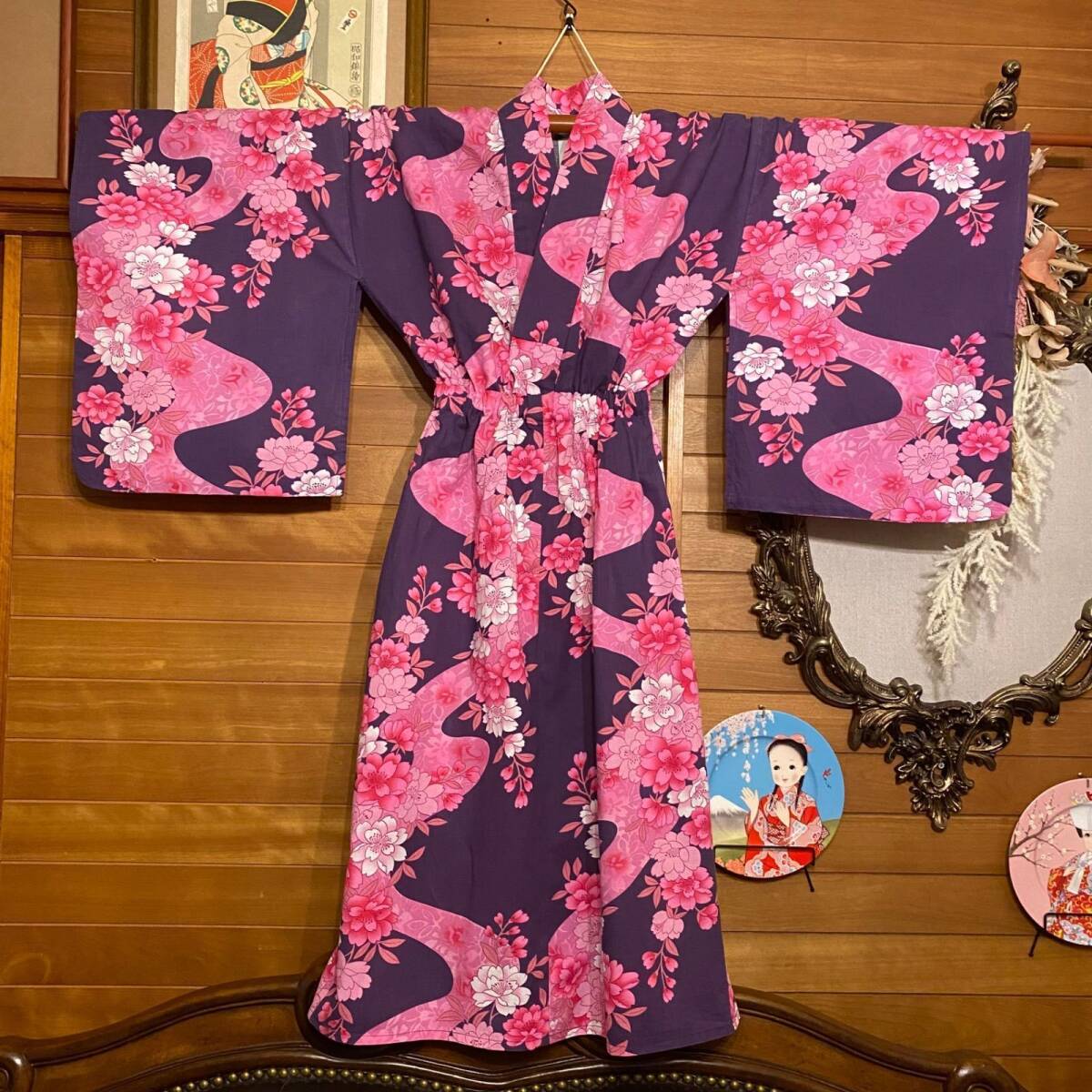 【 和洋折衷 レトロ 古着 お花 フラワー 浴衣 和 モダン ハンドメイド リメイク ワンピース パープル/紫× ピンク 系 W-108 】