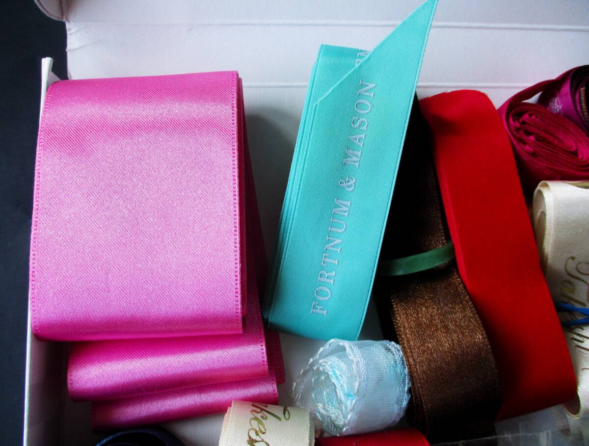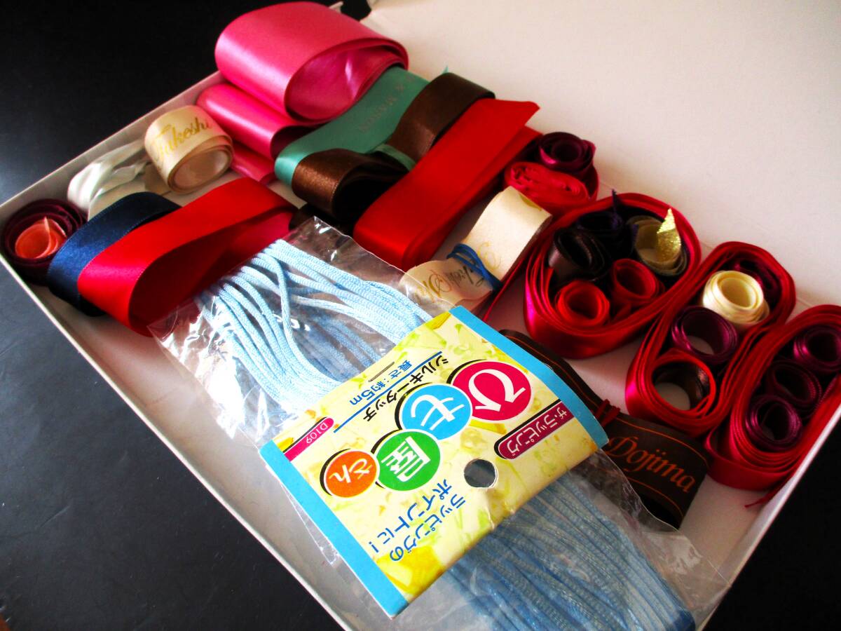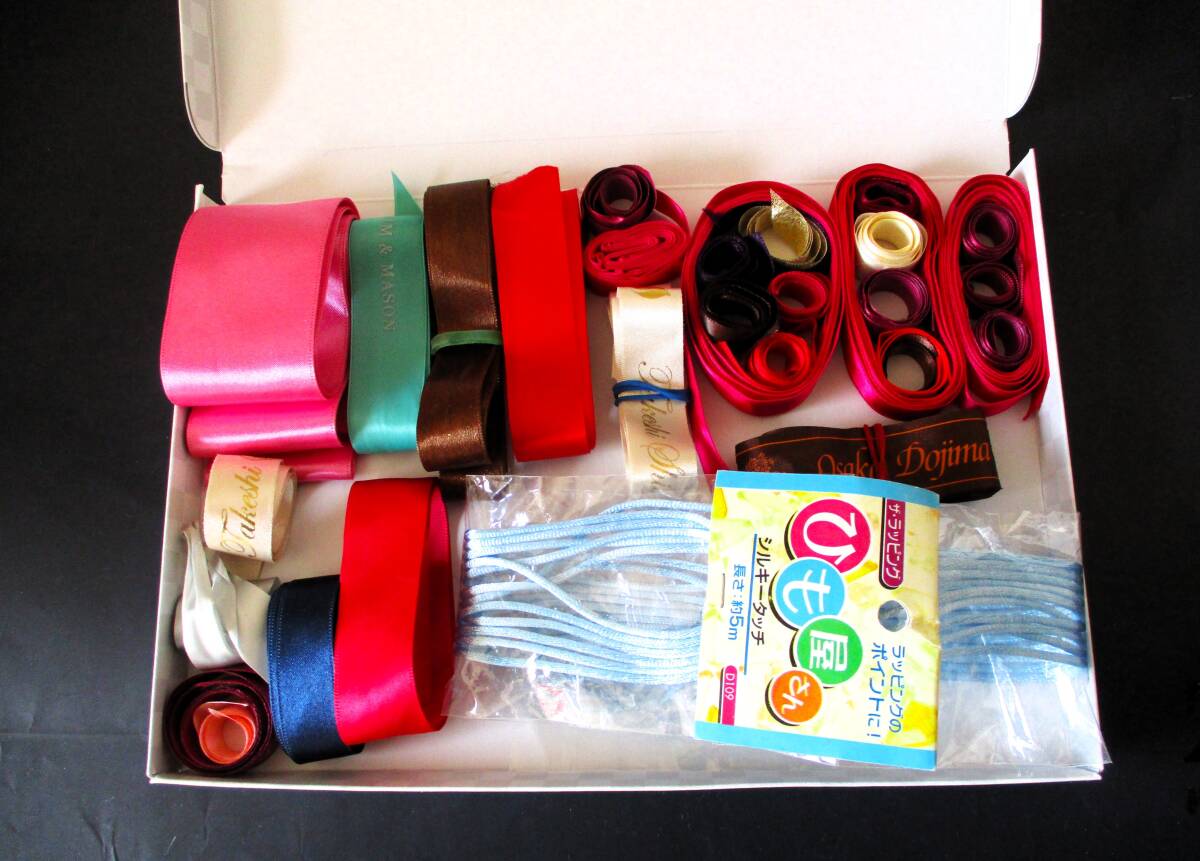 リボンは幅、長さ、厚み等様々です。また、アイロン等の処置はしておりませんので、皺、汚れ、糊痕等あります。