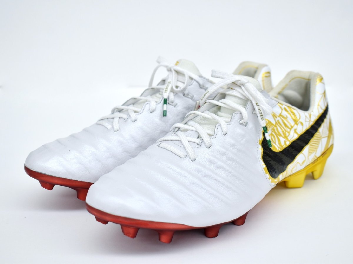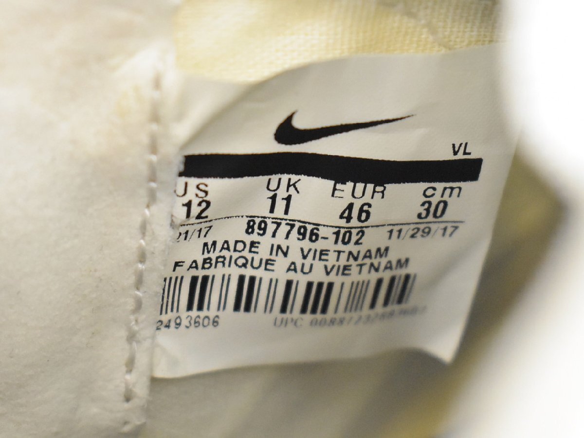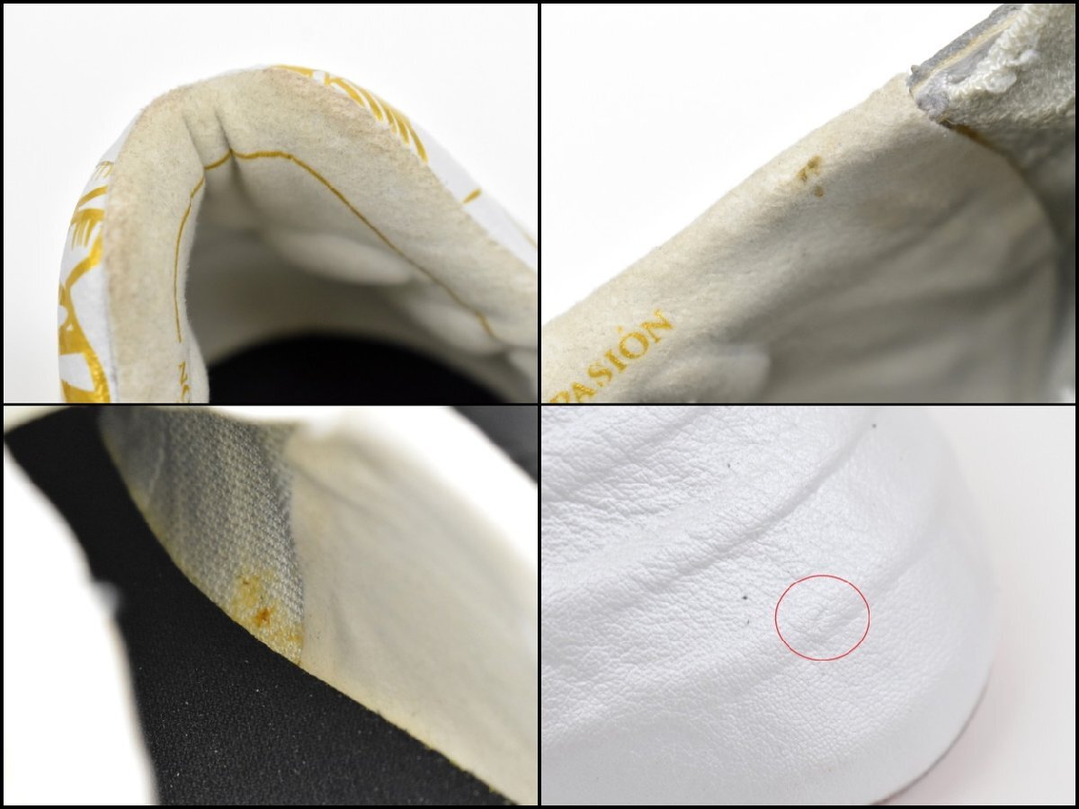 展示品のため、未使用品ですがインソールのフチに糊の変色があり、履き口にヤケによる若干の変色、アウトソールやアッパーに若干のスレキズがみられます。