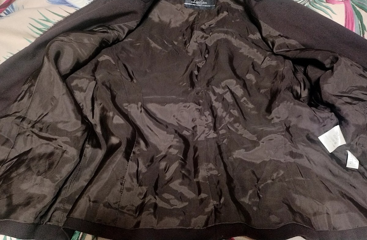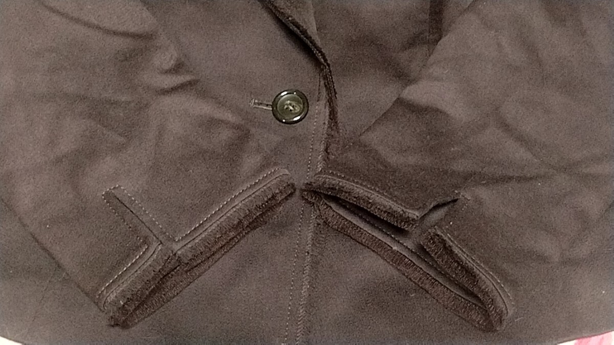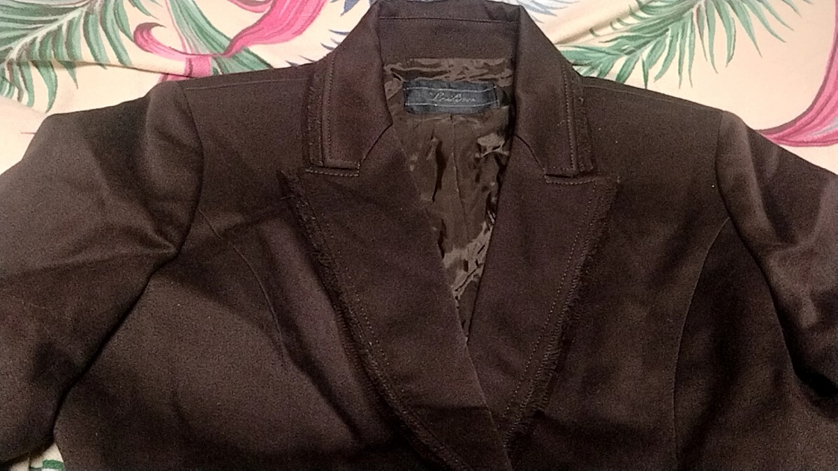 シンプルなブラウンのテーラードジャケットですが、襟やポケットがチュールとフリンジで縁取られたシンプルさの中にもエレガントさ溢れるデザイン☆