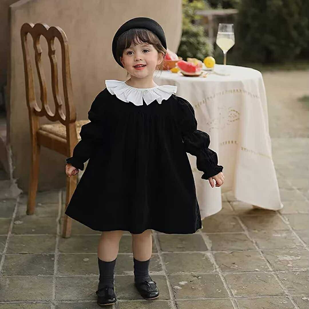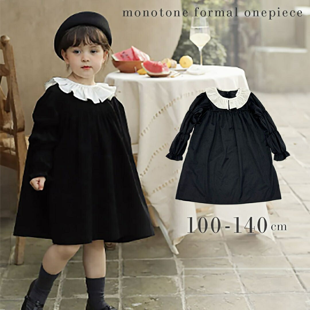 フォーマル 黒 ワンピース 女の子 襟 フリル ギャザースリーブ コードドレス レトロ 可愛い 無地 入学式 卒業式 秋 七五三 おしゃれ 発表会 結婚式 冠婚葬祭 小学校 礼服 お祝い 行事 ジュニア ピアノ発表会 おそろい 洋服 シンプル ブラックワンピース バックボタン きれい 子供服 プレゼント 贈り物 長袖 ステージ衣装 撮影 親子 映え SNS お出かけ 韓国 流行 モダン クラシック ガーリー ふりふり 入園式 卒園式 普段着 モノトーン 上品 セレモニー