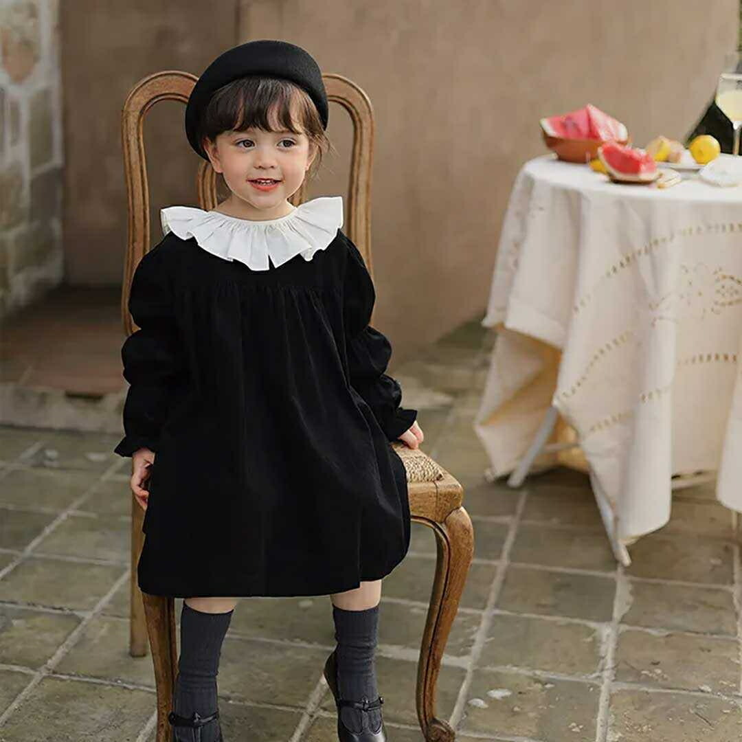 フォーマル 黒 ワンピース 女の子 襟 フリル ギャザースリーブ コードドレス レトロ 可愛い 無地 入学式 卒業式 秋 七五三 おしゃれ 発表会 結婚式 冠婚葬祭 保育園 幼稚園 小学校 礼服 お祝い 行事 ジュニア おそろい 洋服 シンプル ブラックワンピース バックボタン きれい 子供服 プレゼント 贈り物 ステージ衣装 撮影 親子 映え SNS お出かけ 韓国 流行 モダン クラシック ガーリー フリフリ 入園式 卒園式 普段着