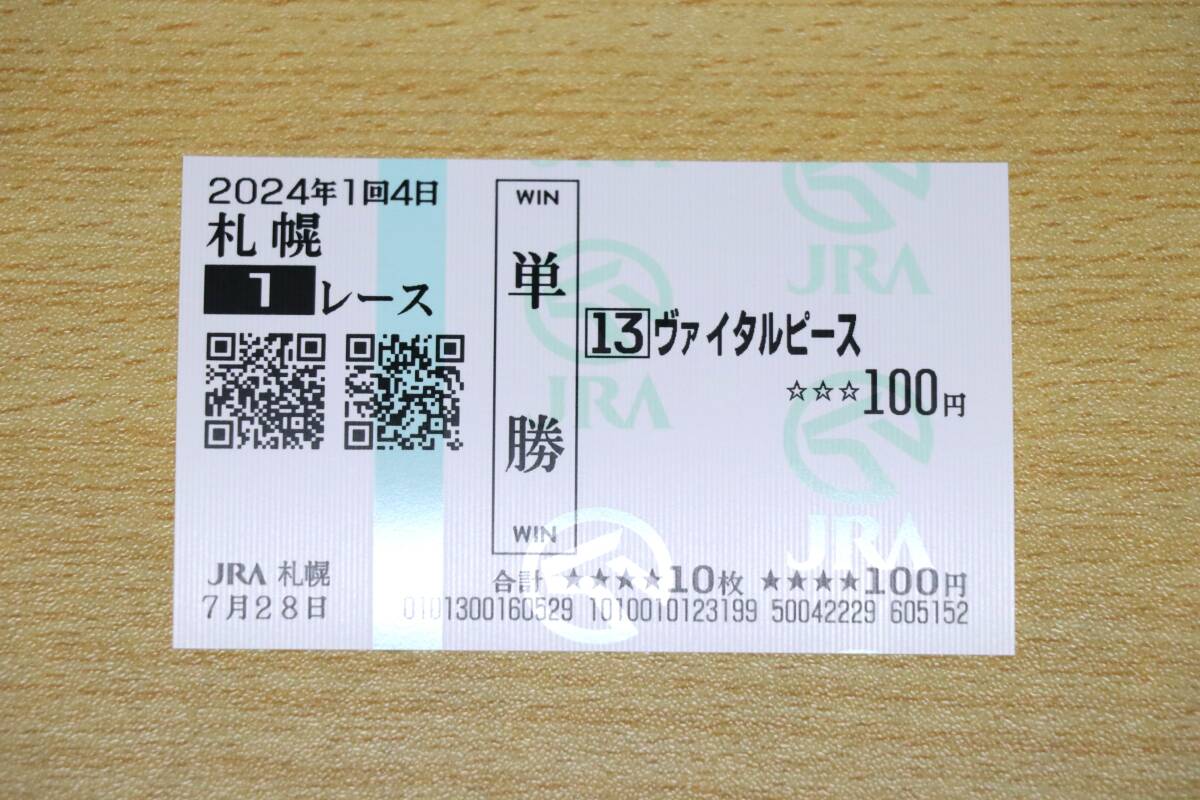 ヴァイタルピース 札幌1R (2024年7/28) 現地単勝馬券(札幌競馬場)です。気に入って頂けた方の落札を心よりお待ちしております。