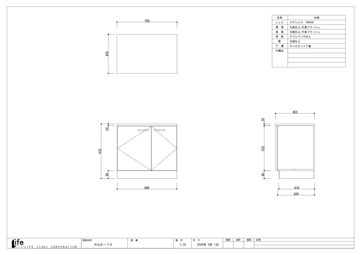 【ライフ住器】RGS-70 13色対応 ガス台 700×455×635 【日本製】
