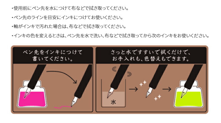 ●ペン先を万年筆用インキに浸しながら筆記する、つけペンタイプの筆記具です。