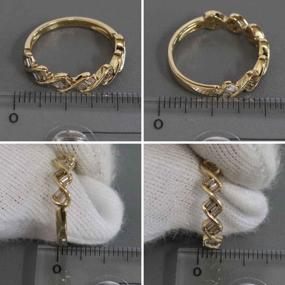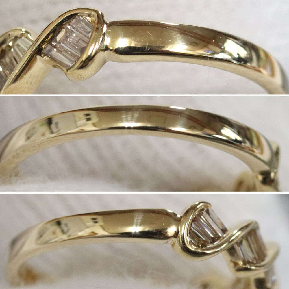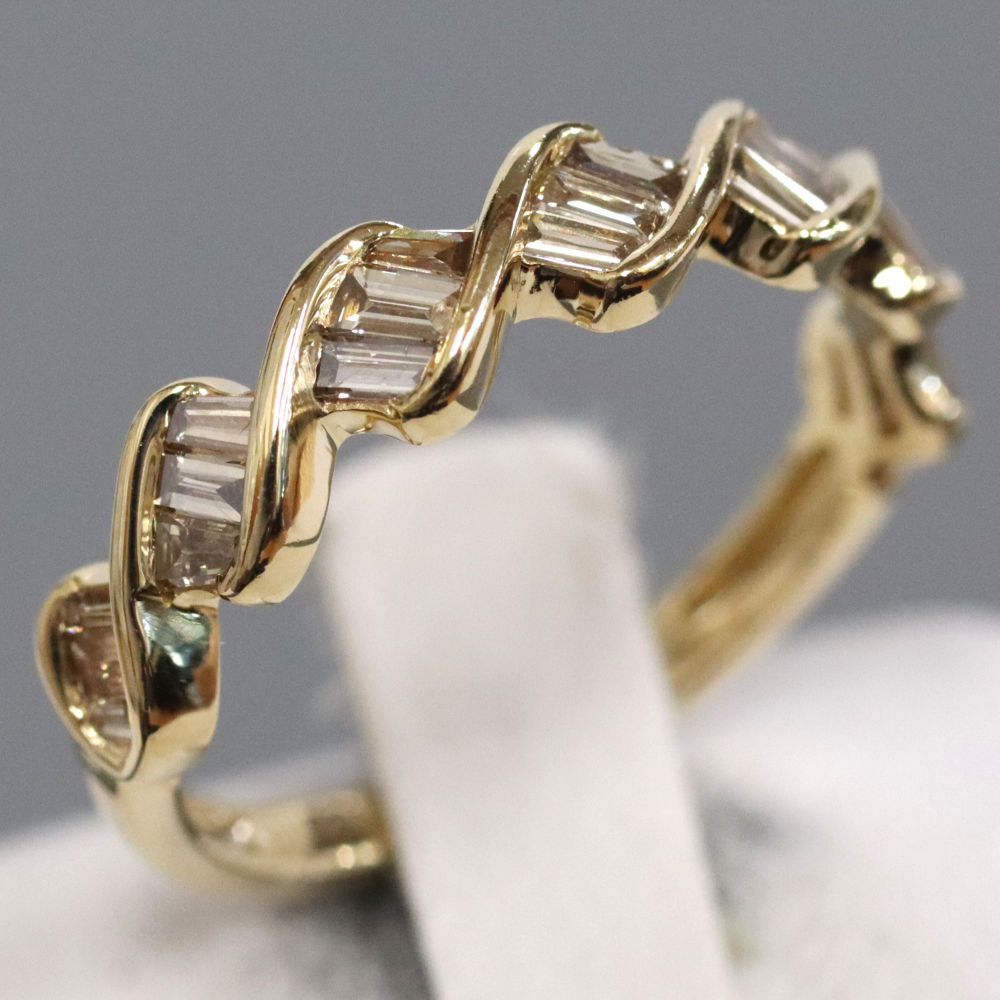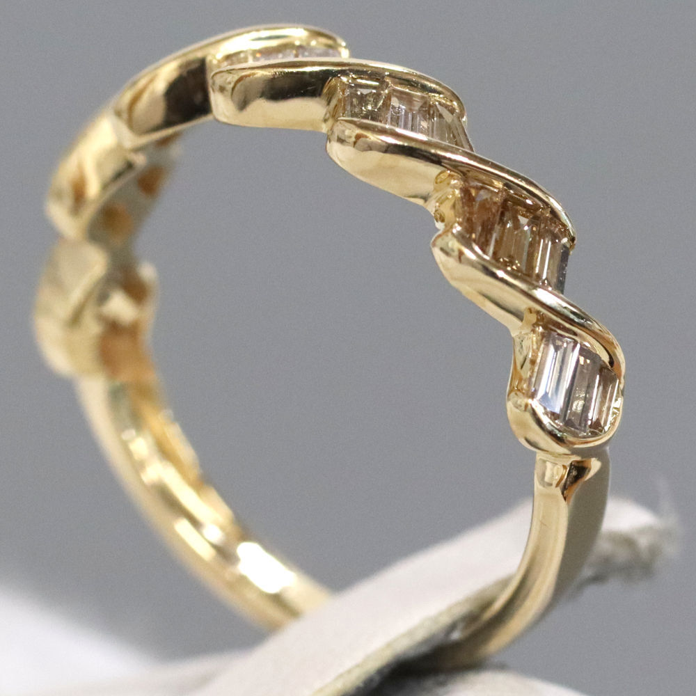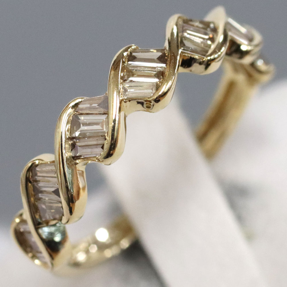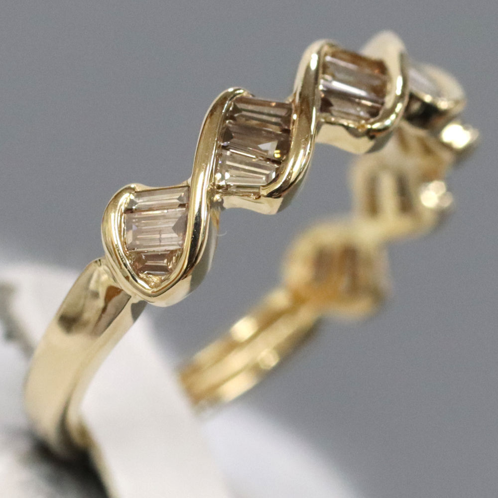 K18ブラウンダイヤモンドリングの中古品です。 渦巻くような地金に、テーパーのダイヤモンドがセットされております。 ダイヤモンドは、インクルージョンがあり、一部天然の割れがあります。 地金に小傷があります。