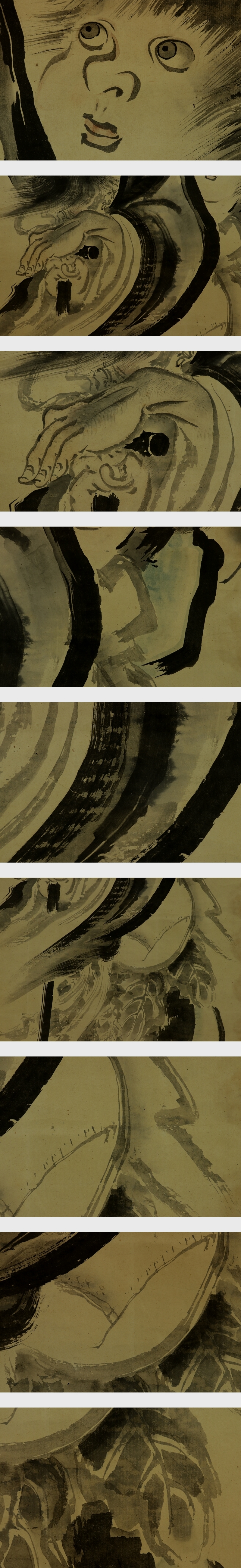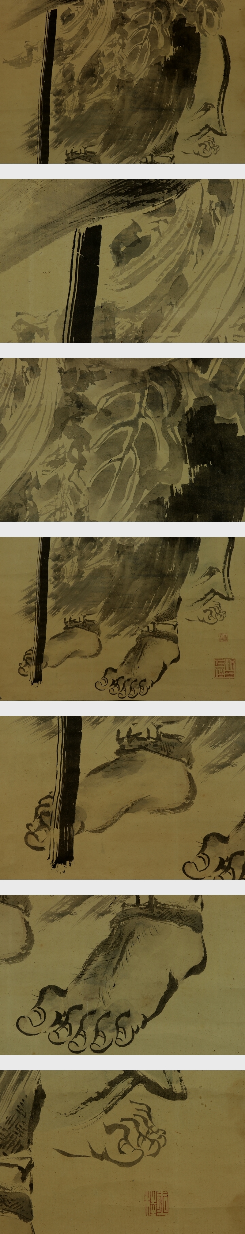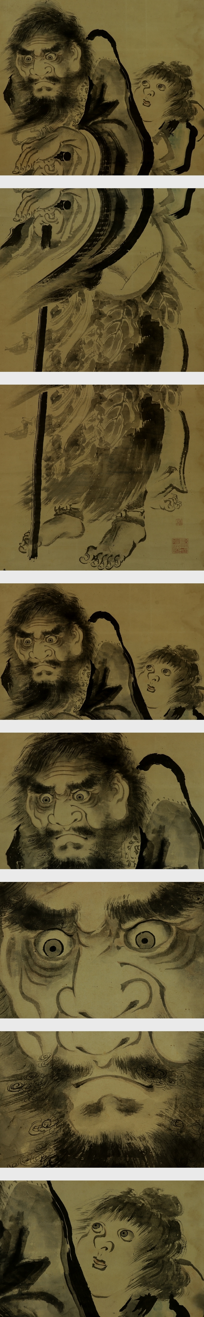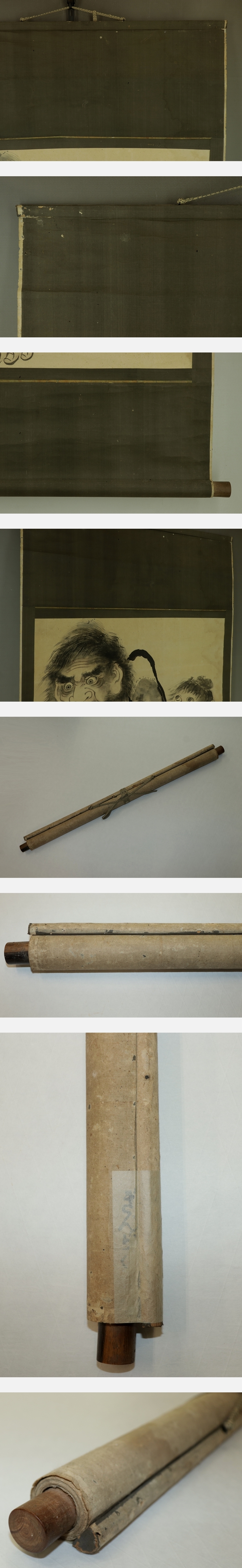 狩野正信 かのう-まさのぶ(1434-1530) 室町後期の画家。伊豆の人。狩野派の始祖。 法名性玄。周文、または宗湛に学んだという。 足利家の御用絵師をつとめ、仏画、肖像画などを制作。 当時画僧の多くが中国画の様式を忠実に追う傾向にあきたらず、 日本人の感覚を生かした画風の興隆に心がけた。法橋に叙せられた。 本紙は、染み、汚れ、強い折れ、皺、虫食い、ヤケ、擦れがあります。 表装は、染み、汚れ、強い折れ、皺、虫食い、破れ、剥れ、ヤケ、くすみ、修理痕、 軸先に汚れがあります。 【サイズ】 作品 横約61.5cm×縦約132cm 表装 横約68cm×縦約181cm |