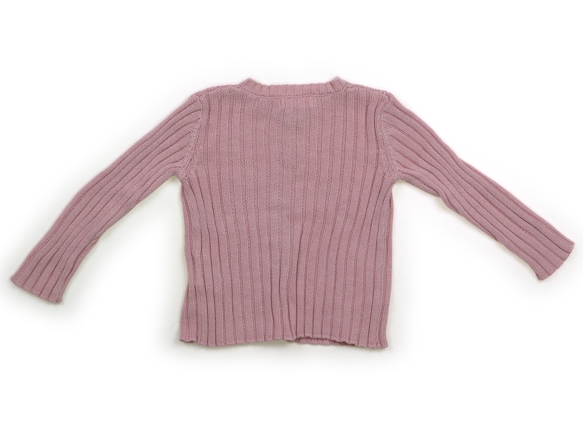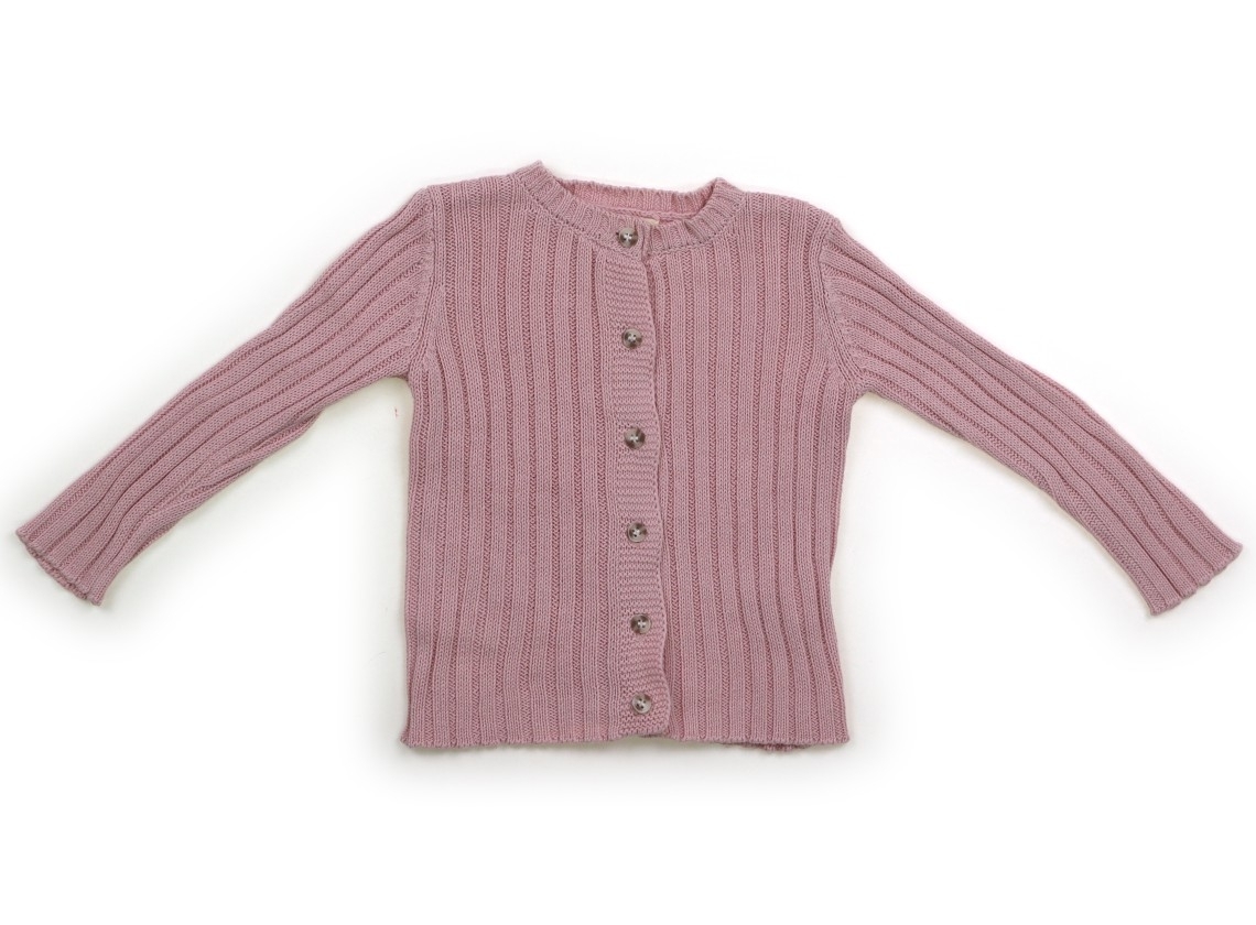 実際のサイズ表記は80-90です。綿とアクリル配合のニットカーディガンです。袖口に薄汚れあり。色あせと洗いざらし感はありますが、まだまだお使いいただけそうです。