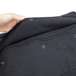 上部はジッパーの開閉に加え、フラップを4つのドットボタンで締める構造。