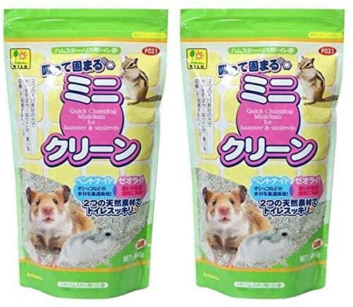 「Sanko 三晃商会 P031 吸って固まる ミニクリーン×2袋」▼4976285250316▼(商品説明)・ 800グラム (x 2) ・・Size:800グラム (x 2)ハムスター・リス用トイレ砂 ●濡れた部分がすばやく固まる ●水分の吸収性と吸臭性にも優れ使いやすい 吸って固まるミニクリーンは、砂地の決めた場所で用を足す習性のあるハムスターなどの小動物のためのトイレ砂です。 主成分のベントナイトがすばやくオシッコなどの水分・汚れを吸着して取り込み、硬質ゼオライトが臭い成分を吸収して消臭し、ベントナイトのヌルヌル感を軽減します。 濡れた部分がすばやく固まり、水分の吸収性はもちろん吸臭性にも優れ、後始末が簡単で使いやすい、便利なトイレ砂です。 <ご使用方法> ハムスター用トイレ容器に本品を約10~15mm程度敷いて下さい。 ハムスターは空間の隅をトイレとして使用する習性がありますので、トイレ容器は飼育ケースの隅にすると良いでしょう。 オシッコなどで濡れた部分が固まりますので、その部分をシャベルなどを使用して取り除き、減った分を補充して下さい。 (定期的に全量交換をしてトイレ容器も洗浄し、衛生を保つようにして下さい。)