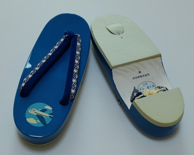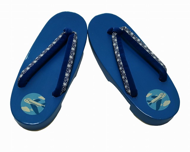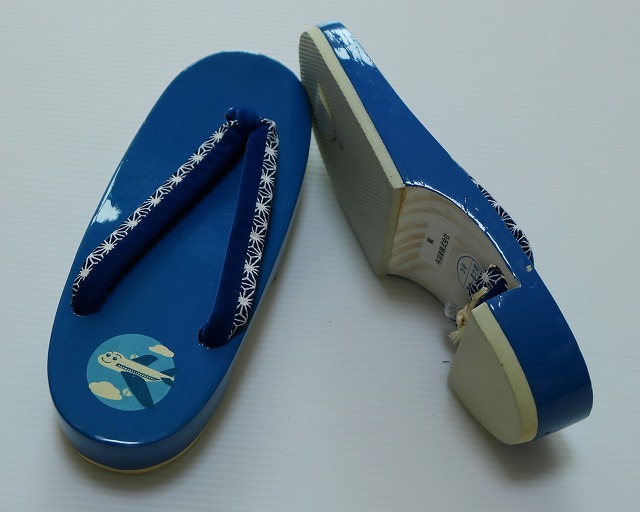 J7700-195-16 福句羽 かかと部分に絵柄があります 青系色の台の男児用(ジュニア用)下駄です。 台の下部分はゴム張りなので 滑りにくくなっています。 お知らせ…在庫処分の訳・難ありの処分価格となっております。台にキズなどがあります ご理解のうえでお求め下さるようお願いいたします。 申し訳ございませんが発送後の返品・交換はお受けできませんのでご了承お願いいたします。 鼻緒の柄ですが、同柄生地を使用しておりますが柄の出方が写真と違う場合もございます ご了承下さい。 こちらは、青色台に鼻緒は紺色の麻の葉柄です。 かかと部分にかわいい飛行機の柄があります。◎ | ||||||