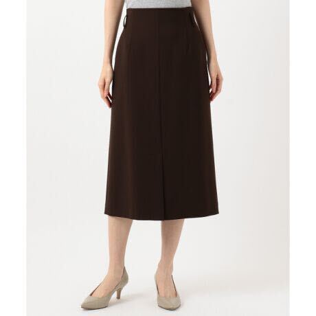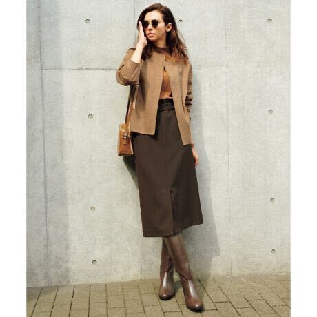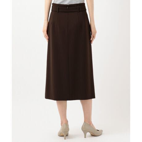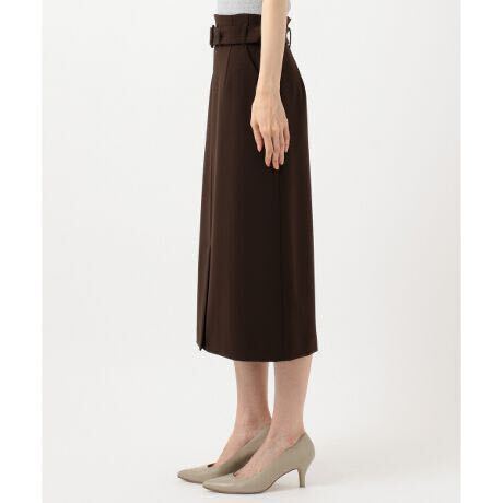 さらりとした肌触りのシーズンレスなギャバ素材のスカートは、スレンダーなIラインシルエットを作りつつ、ストレッチが効いて楽なはき心地。共布バックルベルトでウエストにポイントを持たせ、腰回りがすっきりと見えるデザイン。ハイウエスのシルエットがすっきりと脚を長く見せてくれます。印象を洗礼させるなら、スカートを茶色を軸にグラデーションでカラーを統一。ライトに見せるなら、シンプルにカットソーを合わせて、スカートの美形ラインを際立たせて。