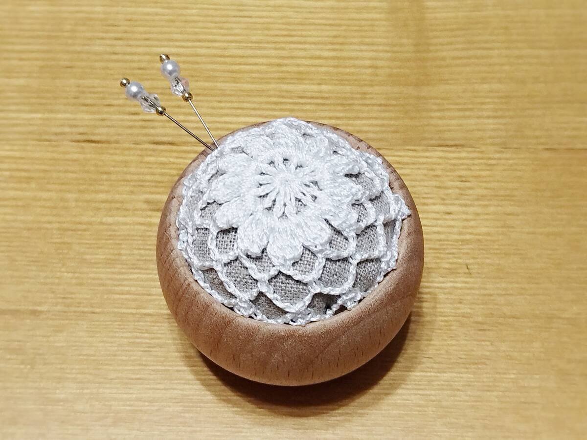 天然木カップのピンクッションと待ち針のセット◆レース◆針山 針刺し