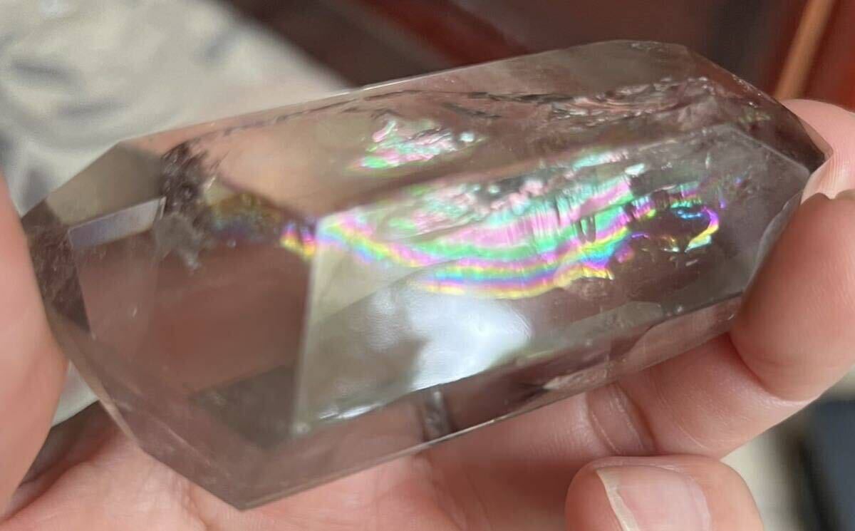 縦約78mm 横約31mm 厚さ約27mm 重さ95.8g 透明度のある良質な天然石で、ご覧の様に美しいレインボーがご覧になれます。表面は全体的にスムースです。こちらはダ-クでは無い明るめの色合いのスモーキ-クオーツです。スモーキークォーツは、ネガティブなエネルギーを吸収し、それを浄化する力があるとされています。これは、古代から悪霊や邪気を払うお守りとして使われてきた歴史とも関係しています。自分の周りにネガティブな影響があると感じる時、この石を持つことで保護の力を得ることができるでしょう。またスモーキークォーツは、グラウンディングの石としても知られています。地に足をつけ、自分自身をしっかりと保つためのサポートをします。エネルギーの流れを安定させ、感情のバランスを取り戻す効果が期待できるため、精神的に不安定な時や、大きな変化を迎える時に非常に役立ちます。浄化してお届け致します。天然石ならではのナチュラルラック等ある場合がございます。なお他のカテゴリーにも同じものを出品しています。ドル高騰に伴い仕入れ値も上がっています。それ以前に仕入れたもので更にかなりお値引きしています。日頃の感謝を込めて final discount