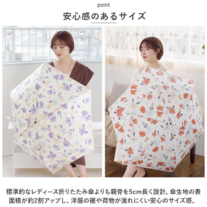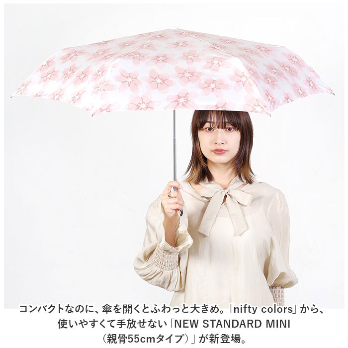 商品説明 | ・・コンパクトなのに、傘を開くとふわっと大きめ。「nifty colors」から、使いやすくて手放せない「NEW STANDARD MINI (親骨55cmタイプ)」が新登場。 ・【安心感のあるサイズ】 ・標準的なレディース折りたたみ傘よりも親骨を5cm長く設計。傘生地の表面積が約2割アップし、洋服の裾や荷物が濡れにくい安心のサイズ感。 ・【晴れの日も、雨の日も♪】 ・傘生地に紫外線防止効果のあるアクリルコーティング加工を施し、雨の日だけでなく、晴れの日にも活躍する晴雨兼用タイプ。 ・【UVカット80%以上】 ・UVカット率80%以上の傘生地が、日射しとともに降り注ぐ紫外線もブロック!紫外線が気になる女性の心強い味方♪(※傘生地の色味により、紫外線遮蔽率が異なります。濃色:約90%、淡色:約80%) ・【持ち運び、コンパクト】 ・雨や日射しをしっかりと防ぐ丈夫な構造なのに、重さ約190gの軽量設計!いつものカバンにちょこんと忍ばせて、持ち運びが楽ちん。(※傘袋を含む重量です。) ・【軽くて、しなやか】 ・スリムで軽量なアルミ素材に、グラスファイバーを組み合わせたハイブリッド構成の親骨パーツが強い風をしなやかに受け止めるヒミツ。 ・【スムーズな手開きタイプ】 ・混雑した場所でも傘生地をスムーズかつ、安全に開くことのできる手開き式。 ・【安全カバー付きで安心】 ・ハジキ部分には爪や指を挟む心配のない安全ろくろカバー付きなので、ネイルアートをした指先もしっかりガード。 ・【たたむ時も手間取らない!】 ・玄関に入るときに傘生地がサッとまとめやすい、スナップボタンタイプの留めバンドを採用。 ・【コロンと小さなハンドル】 ・「nifty colors」のロゴ刻印入りの手元ハンドルは、コンパクトに持ち運べるようコロンと小さめに。付属のケースに入れればかさばらない! ・【心華やぐテキスタイル】 ・水彩画のように淡く優しいフローラル柄から、道行く人が振り返るほんわかアニマルデザインまで、バラエティ豊かなカラーラインナップ。雨空に大人可愛さがパッと花咲く、自分だけの1本が見つかる♪ |