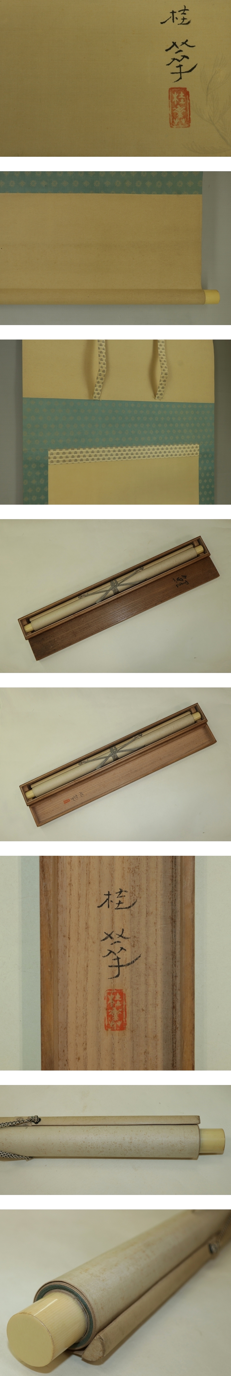 金島桂華 かなしま-けいか(1892-1974) 大正-昭和時代の日本画家。 明治25年6月29日生まれ。 西家桂州,平井直水に師事,のち竹内栖鳳に入門。大正14年「芥子」が帝展で特選。 昭和12年京都市美術工芸学校教諭となり,画塾衣笠会を主宰する。 29年「冬田」で芸術院賞。芸術院会員。 昭和49年9月16日死去。82歳。広島県出身。本名は政太。 本紙は、軽い染み、軽い皺、ヤケがあります。 表装は、染み、汚れ、軽い皺、ヤケ、軸先に汚れがあります。 【サイズ】 作品 横約50.5cm×縦約33.5cm 表装 横約64cm×縦約126cm |
