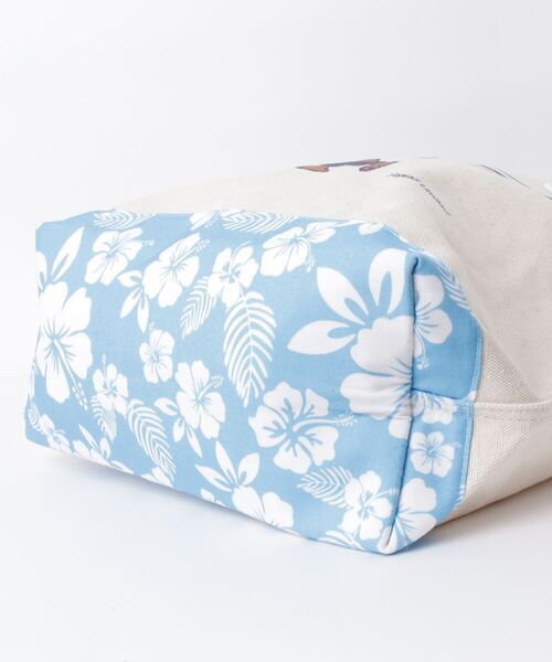 こちらは日焼けしたスヌーピーがサーフィンしているデザインになります。パステル系のキレイめブルーにホワイトのハイビスカス柄が、ハワイ好きに大人気!