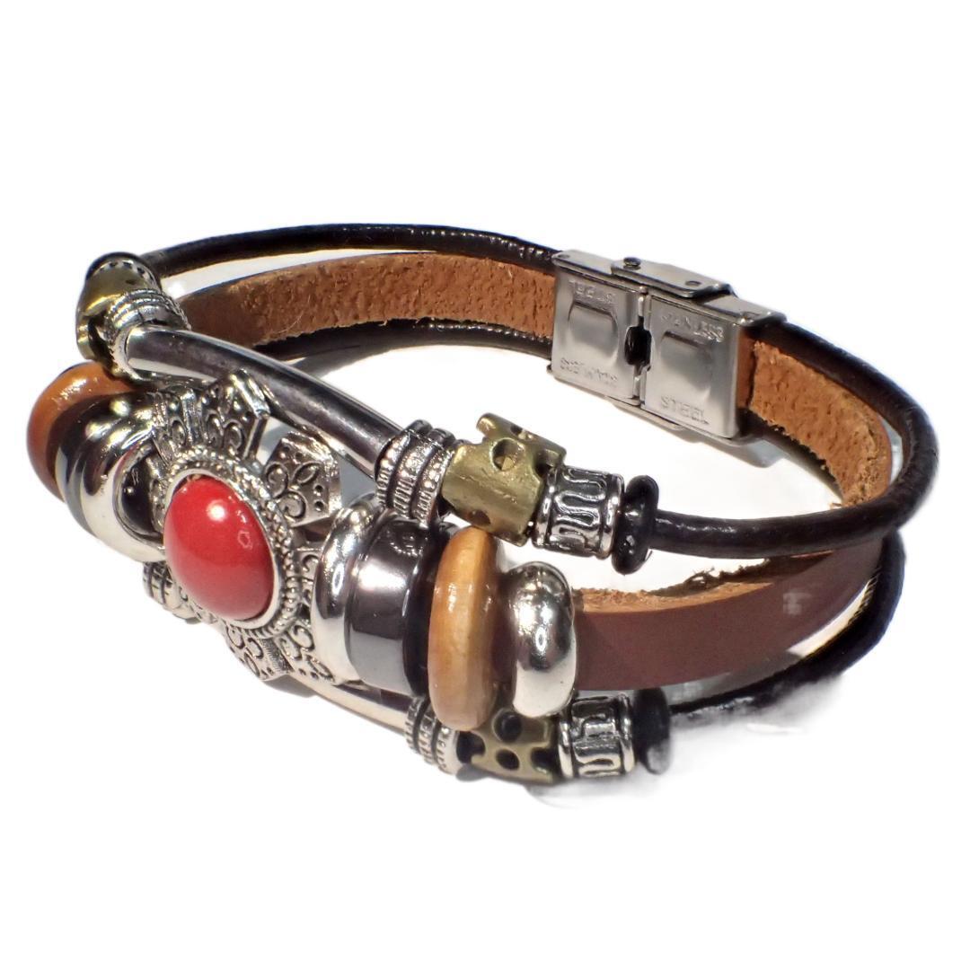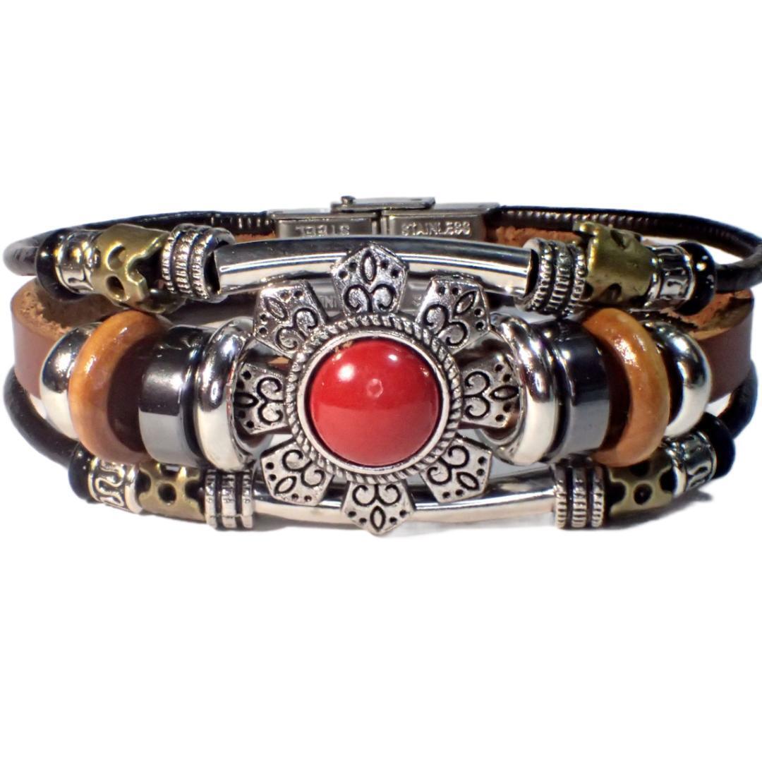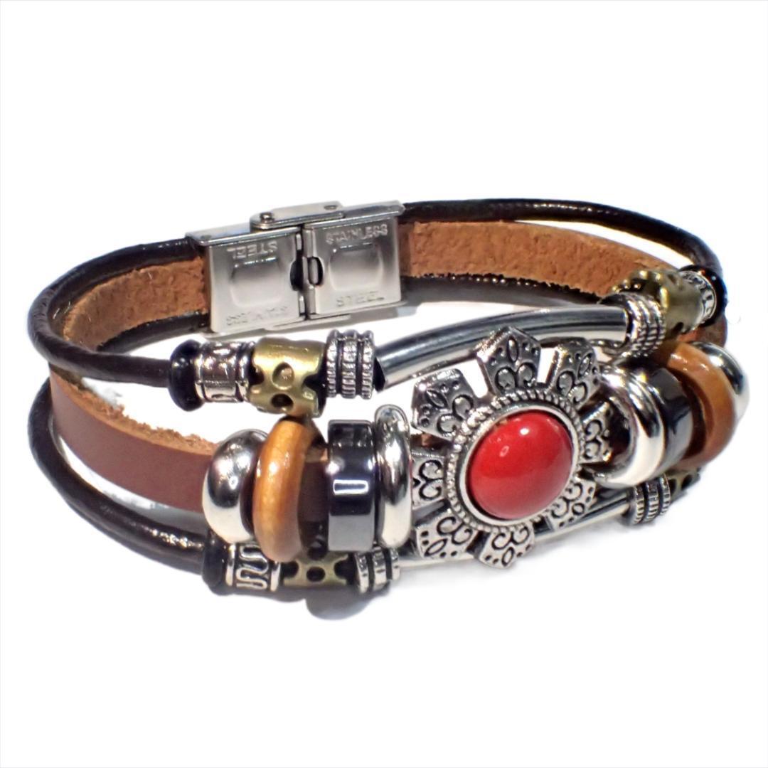 三連 赤色 天然石 レッド レザーブレスレット インディアン 茶色 Ⅱ■アクセサリー バングル リストバンド