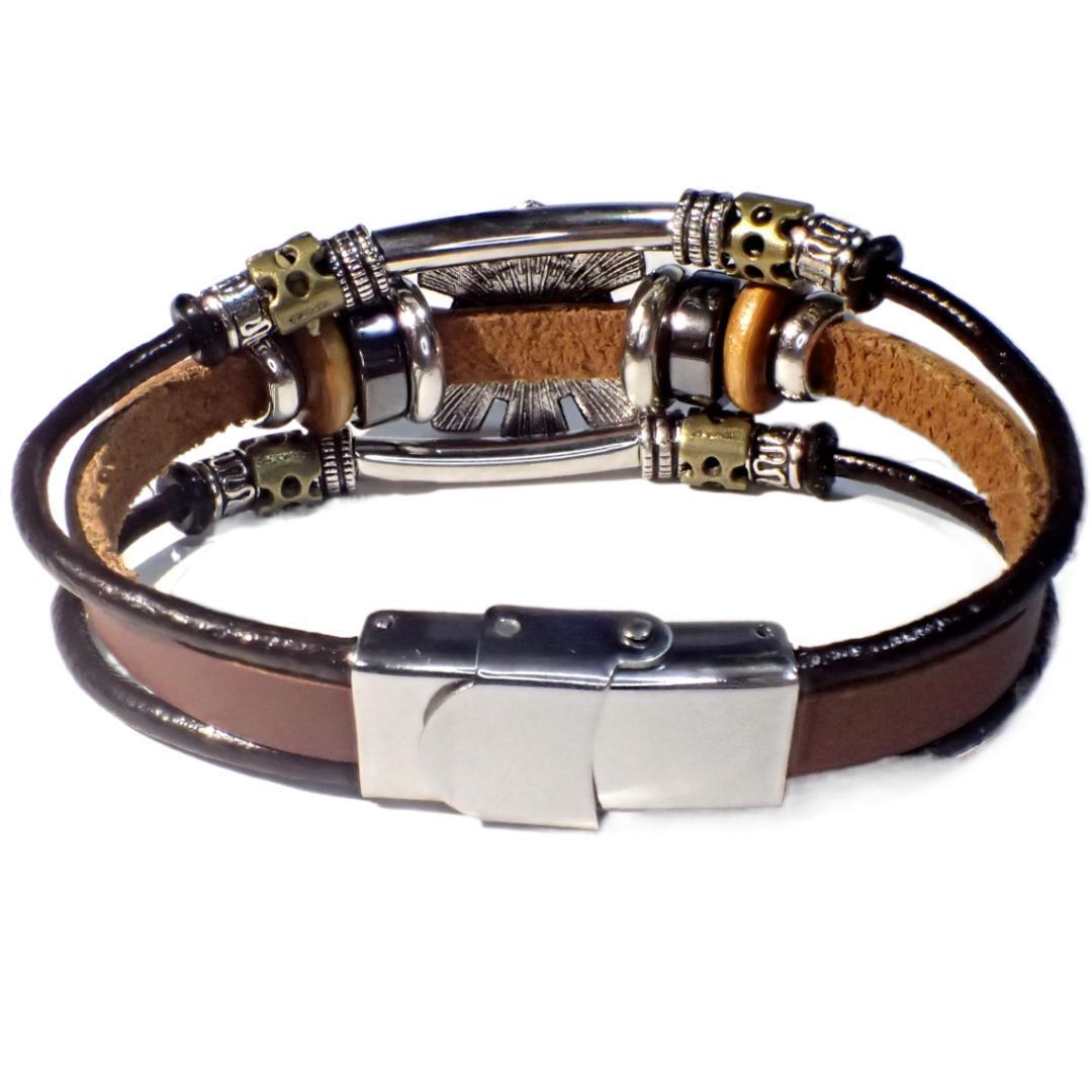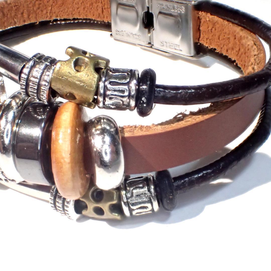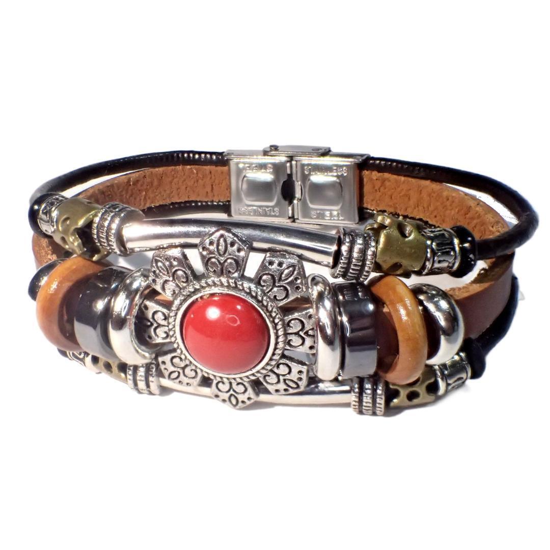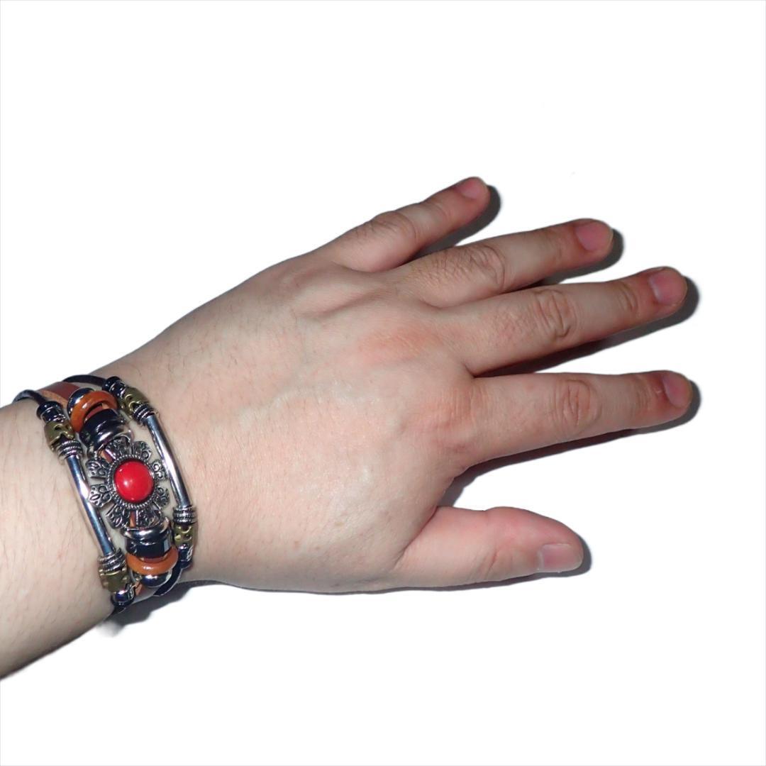 三連 赤色 天然石 レッド レザーブレスレット インディアン 茶色 Ⅱ■アクセサリー バングル リストバンド