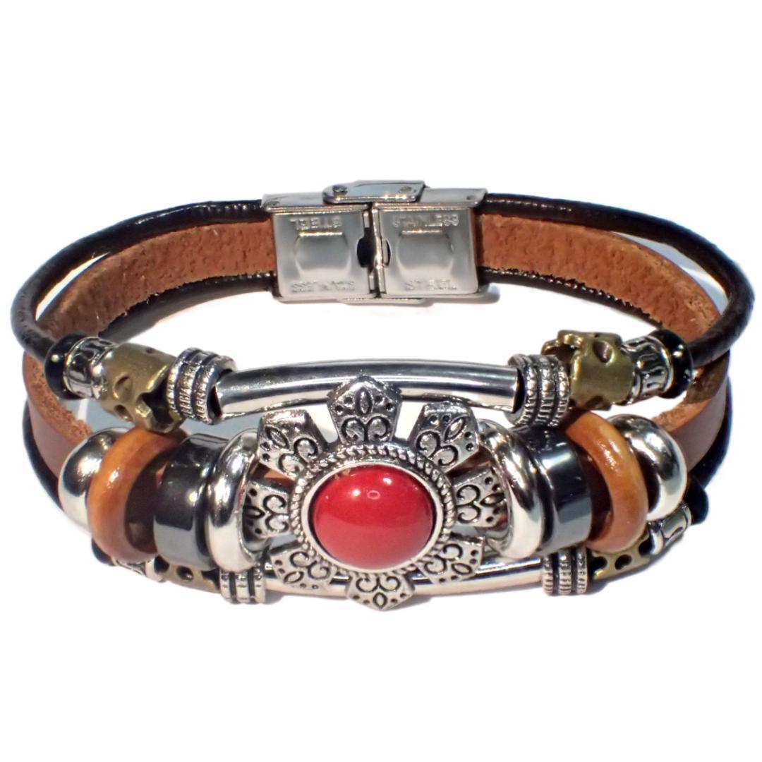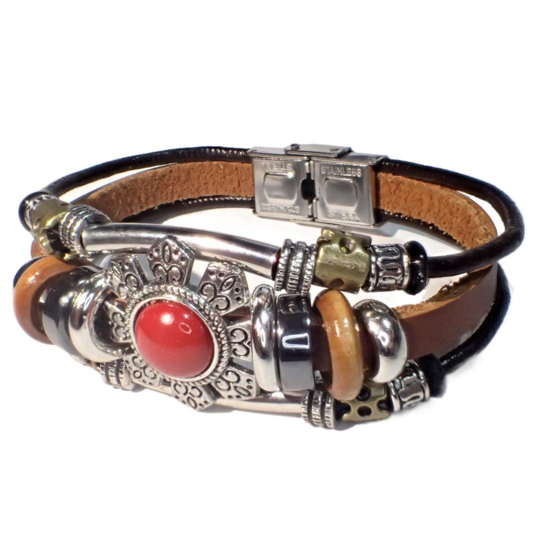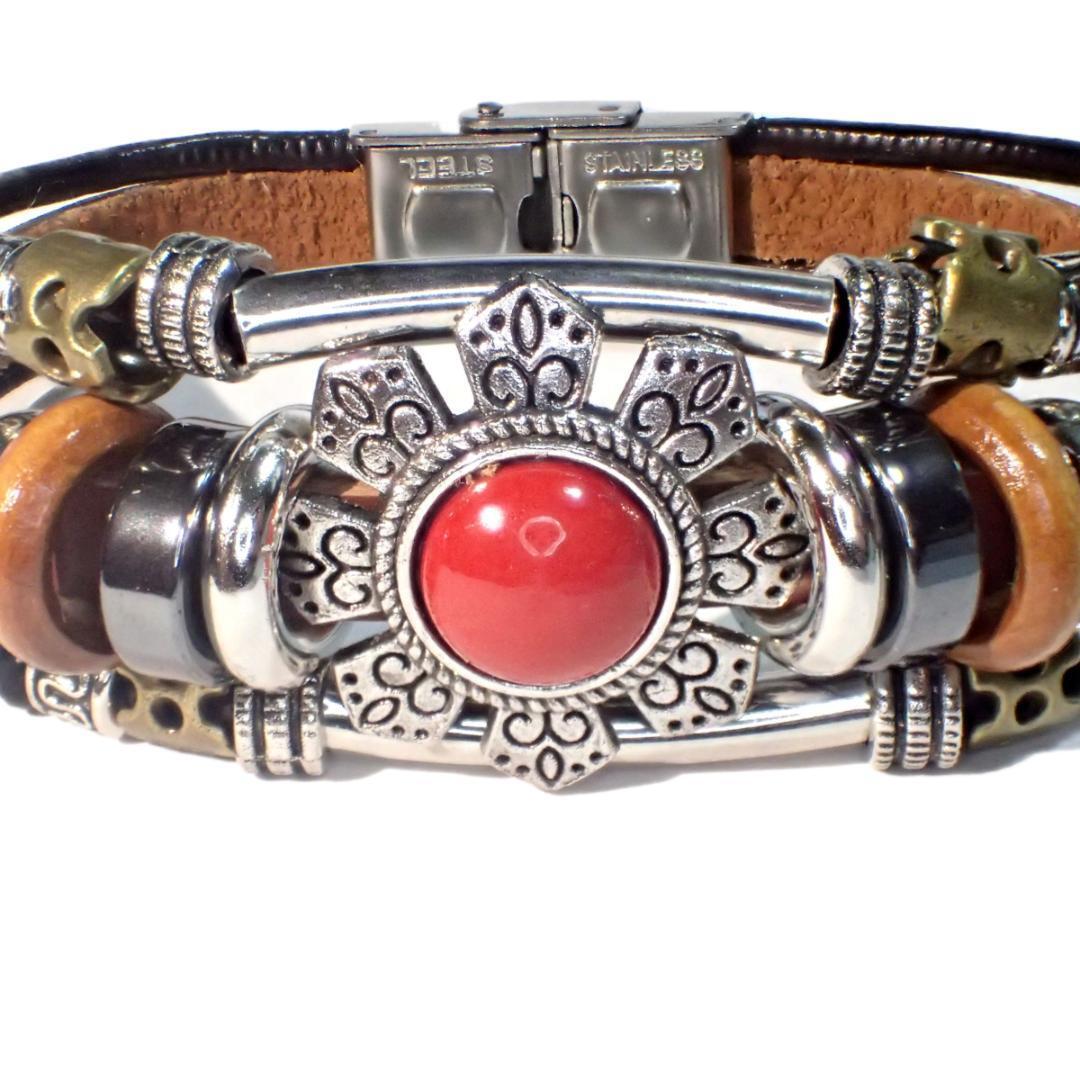 丸い赤色の石に、銀色やブロンズ色の装飾された金具の付いたカッコいいブレスレットです。