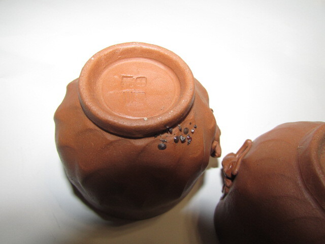 (会津若松・骨董屋から購入)(古い時代の味わいのある作家物 田嶋勝三印・万古焼 手び練り蛙貼り付け酒器2セット)・貴重・珍品