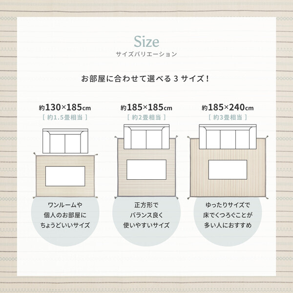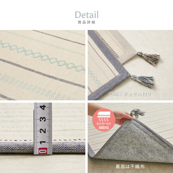 ざっくり感のあるコットンの心地よい手触りと やわらかな風合いが魅力のインド綿100%ラグ。 通気性の良い綿で足元さらり。 年中使えるタッチ感もインド綿の人気の秘密です。 毛足がないので、ゴミがたまりにくく 日常のお手入れもコロコロ(粘着シート)などで簡単。 また、洗濯機で洗えるので汚れても安心です。 小さいお子様がいるご家庭にもおすすめです。 中材にウレタンフォームを入れた3層構造で底付き感を軽減。 異なる生地(表面・中材・裏面)をボンディング(接着)する製法で、 それぞれの特性を活かしつつ見た目もフラットですっきりしています。 裏面は、床にやさしい不織布貼りです。 ホットカーペット・床暖房対応です。 軽量で柔らかく、コンパクトに折りたたむことができます。 洗濯時の持ち運びや模様替えの際もラクラクです。 約185×240cm ■生産地:インド ■素材・成分:表面:綿100% 中材:ウレタンフォーム 裏面:不織布 タッセル付き ※洗濯機で洗えます。 (ドラム式不可)ホットカーペット・床暖房対応 【画像について】 ・商品は、モニターによって色合いが異なって見える場合があります。 【商品について】 ・長期間敷きつめたままにしておきますと床材が黄変色したり、カーペットの裏面が付着するおそれがありますので、時々カーペットをずらして床面をお拭きください。 ・商品の特性上、折りジワや表面の柄の多少の歪みや、表示サイズより多少の誤差が生じる場合がございますのでご了承ください。 ----------- 着日指定をお受けすることができません 発送後、お問い合わせ番号をご連絡いたしますので 配送会社と調整をお願いいたします ----------- |