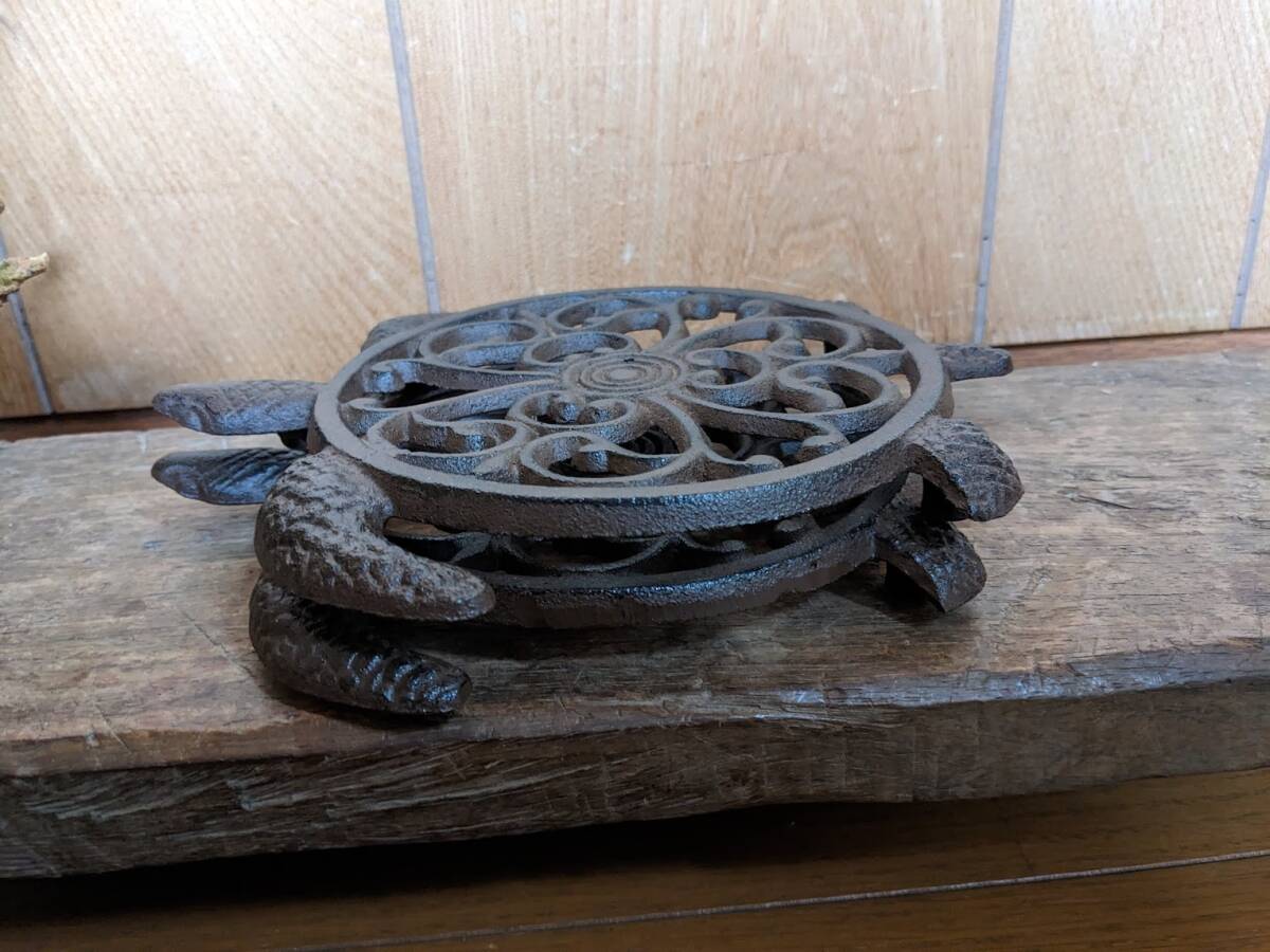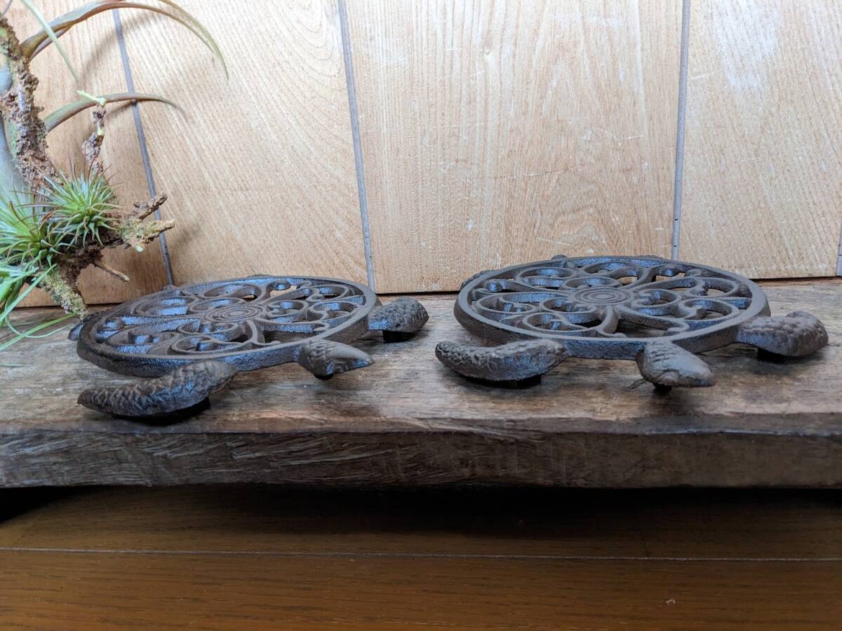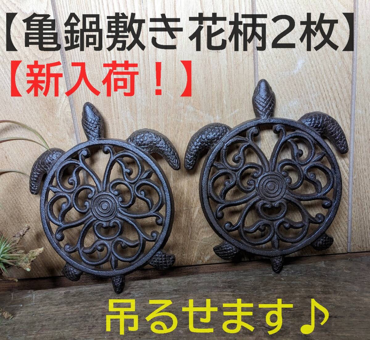 【亀鍋敷き花柄2枚】透かし 鍋敷き なべしき 鉄 キャンプ 一人鍋 亀  カメ 縁起物 鉄製 キャンプ アウトドア