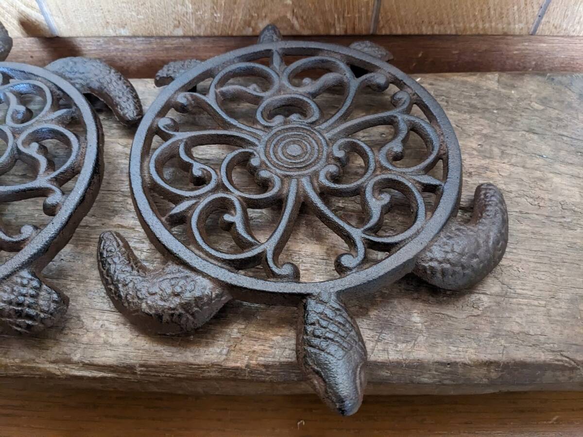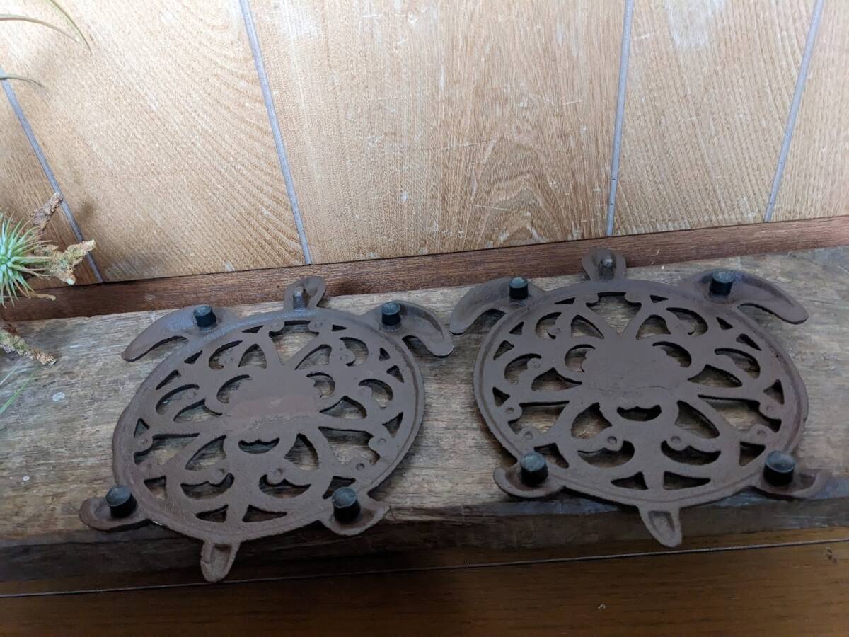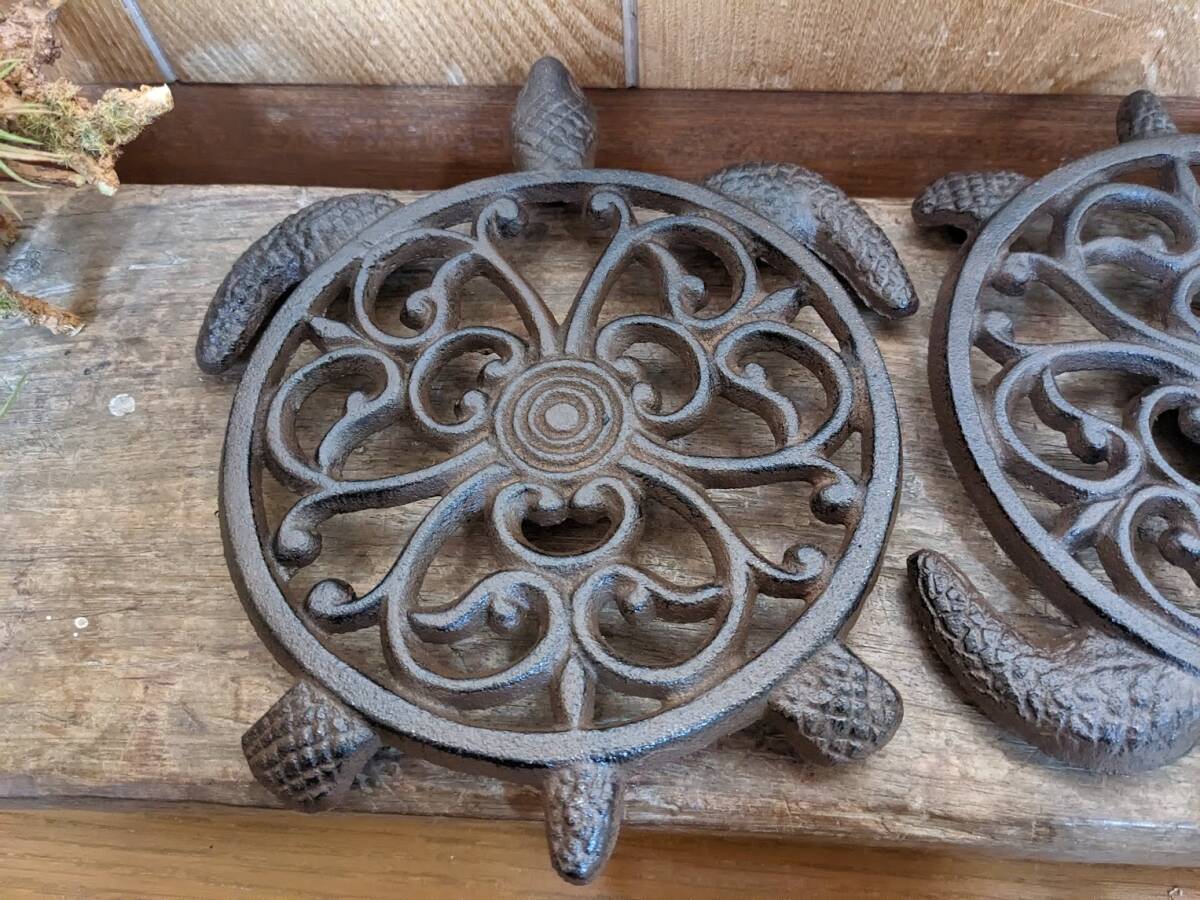 【亀鍋敷き花柄2枚】透かし 鍋敷き なべしき 鉄 キャンプ 一人鍋 亀  カメ 縁起物 鉄製 キャンプ アウトドア