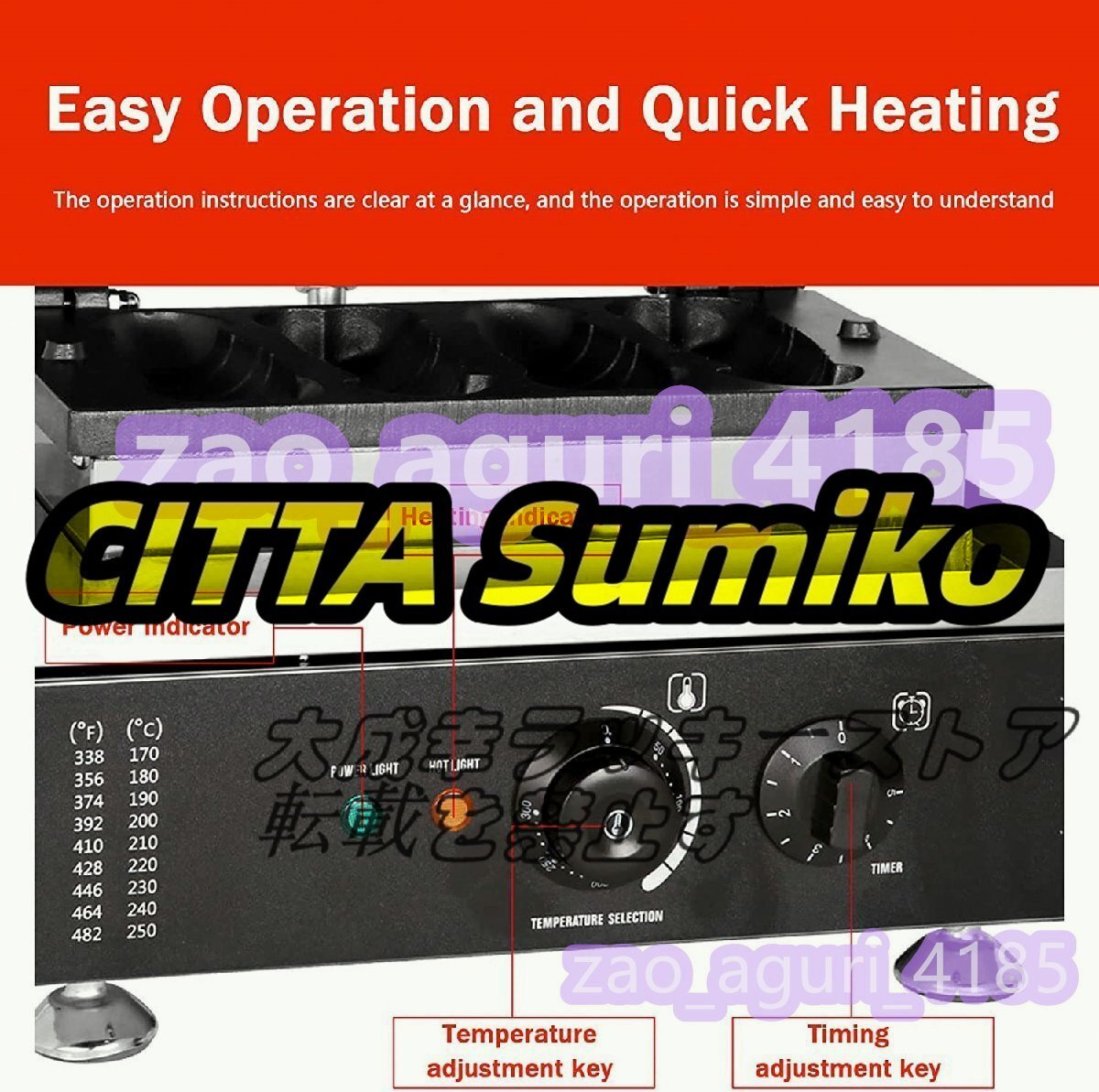 スマートコントロールパネル:電気タイマーと温度調整ボタン、0~5分、50~300℃。 LEDライトはヒーターの状態を示します。パンケーキの焼き上がりをアラーム音で知らせてくれます。