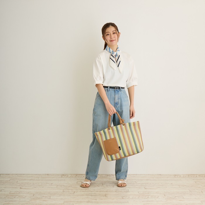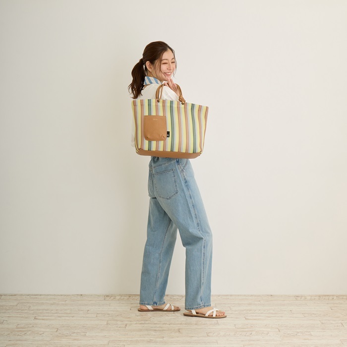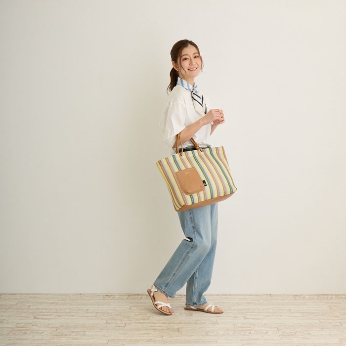 商品説明 | ・・フワフワした触り心地、暑い季節にもベタ付きにくい! ・生地やクリームが重なり合い、網目模様が特徴のウェファースから名付けた「ウエッファ」(ウエッファはウエファースの単数形です。) ・持ってるだけで映える! ・フェイクレザーのかわいいハンドルとルーポケットがアクセント。 ・オモテとウラと使い分け。 ・ルーポケット面を気分やファッションに合わせてチェンジ。持って楽しいデザインです。 ・カラフルなストライプ柄。柄の出かたはいろいろ。ひとつひとつ違った表情をお楽しみください。 ・A4サイズのファイルが収納できるサイズ。 ・ボトル、ランチボックス、ポーチ、傘などもらくらく収納。フェイクレザー底で、しっかり安定するつくり。 ・ドットボタン開閉で、中身を隠せて安心です。 ・サラリとした手触りは暑い季節にもベタつかず、快適。いつでも清潔に。汗ばむ季節のデイリーなご使用にオススメ! ・手洗い可能(手おし洗い推奨)で、衛生的に安心してご利用いただけます。 ・季節を問わず大活躍です。 |