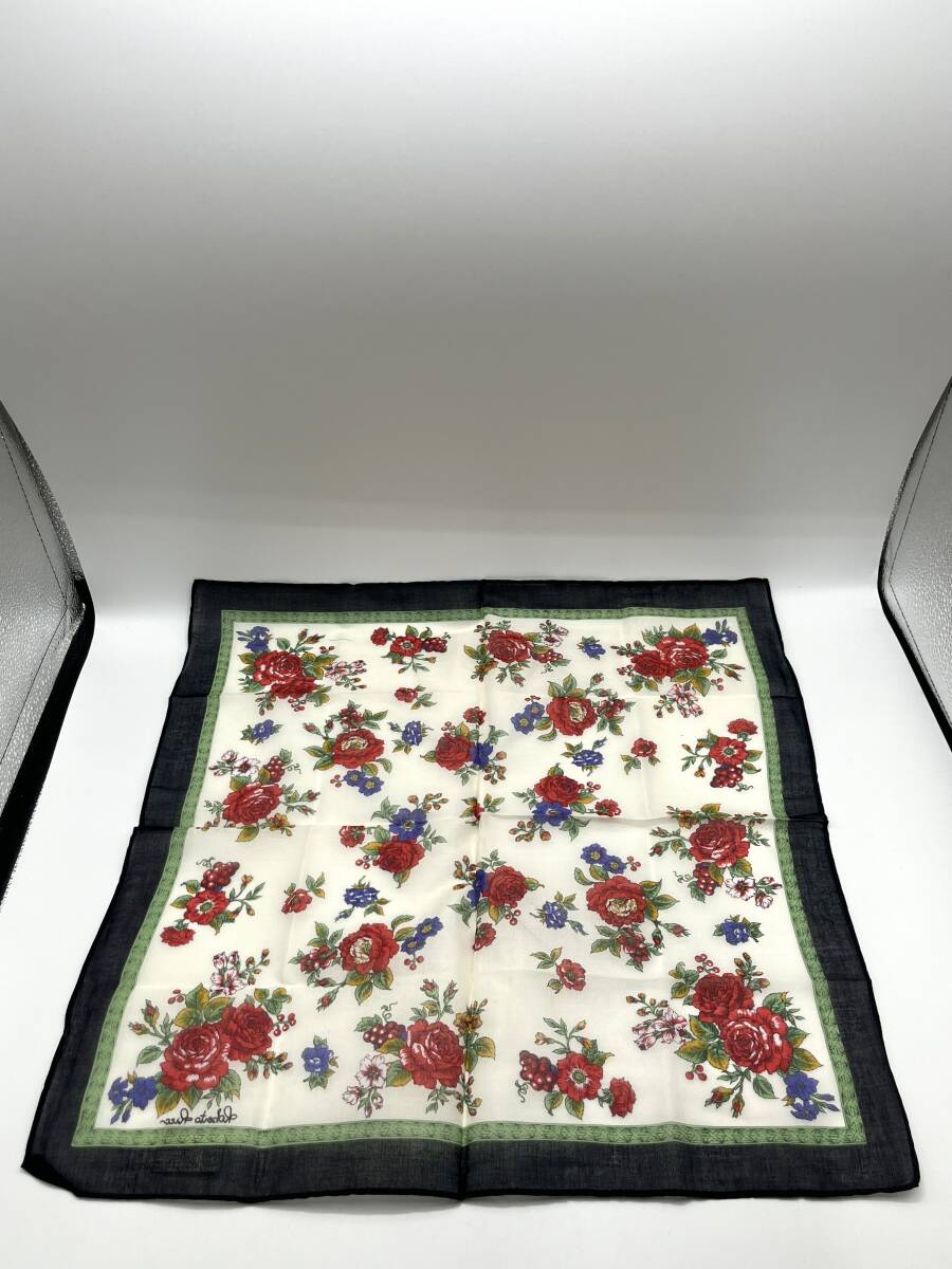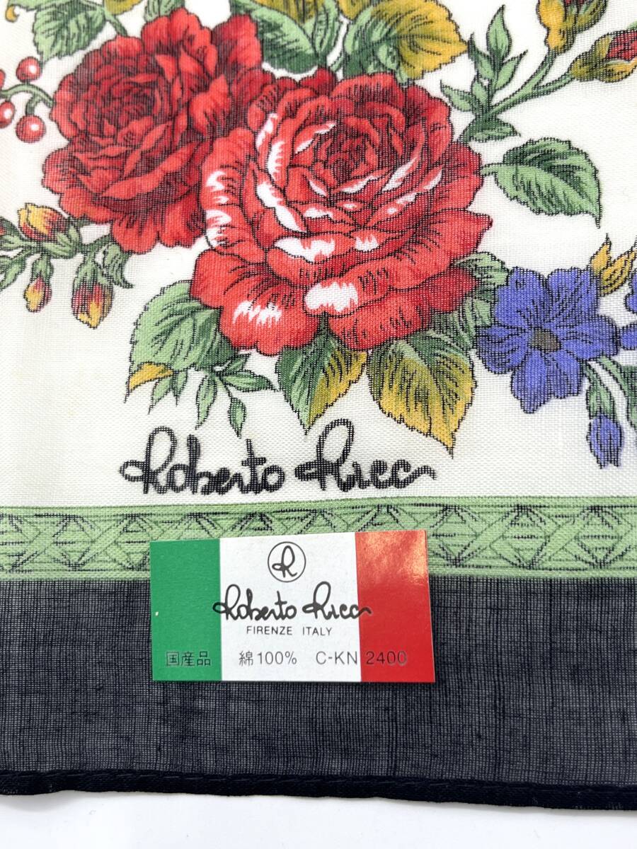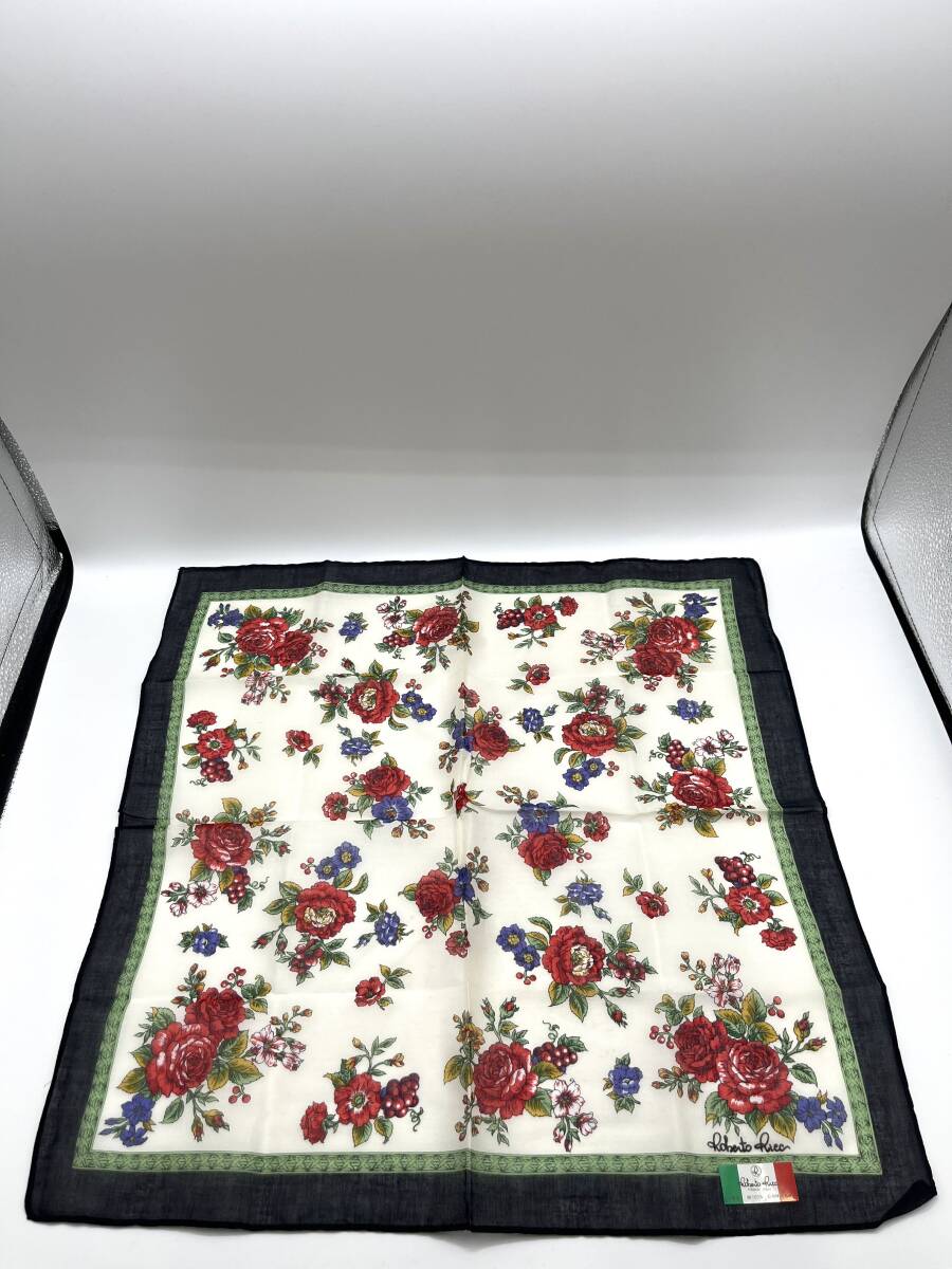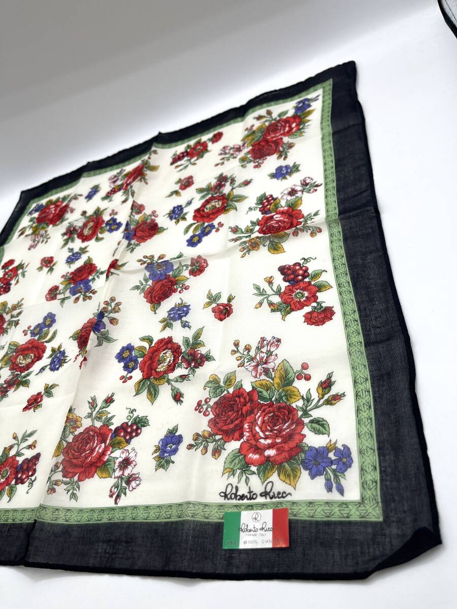 【未使用品】Roberto Riec ハンカチ バンダナ 花柄 フラワー レッド×パープル×グリーン×アイボリー 縁ブラック コットン 綿100%